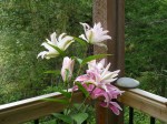 Every year I plant a few lilies to supplement what I already have growing in pots on the decks. Sometimes I buy an unnamed assortment package and then watch an unexpected exuberance of red or orange or yellow as the buds open on warm summer mornings. My favourite lilies are “Casablanca”, a pure white Oriental, with a beautiful fragrance. I thought that was what I’d planted in the southwest corner of the deck where we eat our dinner most evenings. There are sweet peas growing along the rails and I knew the white lilies would look very lovely against the tangle of green vines and rich red and purple sweet peas. Oh, and I anticipated the smell of the lilies as we ate at the table under the wisteria and grapes, a blue bowl of sweet peas on the French cloth.