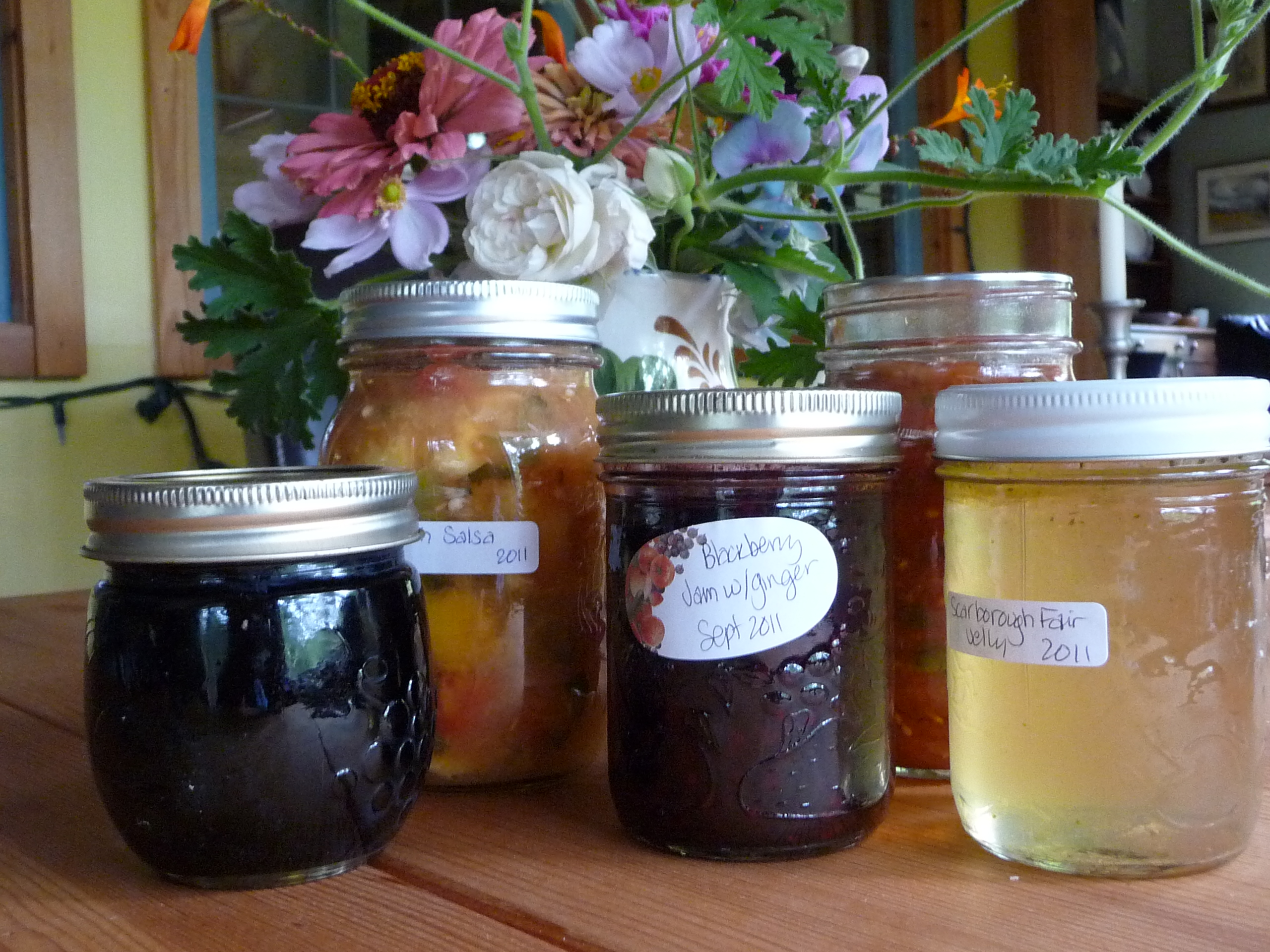 And here are the true jewels of fall. Our pantry shelves are lined with jars of the summer’s bounty: blackberry jam, salal jelly, herb jellies, peach salsa, tomato salsa, peach and apple chutney. Such a gift in winter, to take a jar from the dark shelf and open it for its concentrated flavours of sunlight and warm earth.