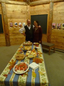 I’ll post a photograph of the crowd listening to the reading and one of John and me just after we’d arranged all the food on a table strewn with leaves.