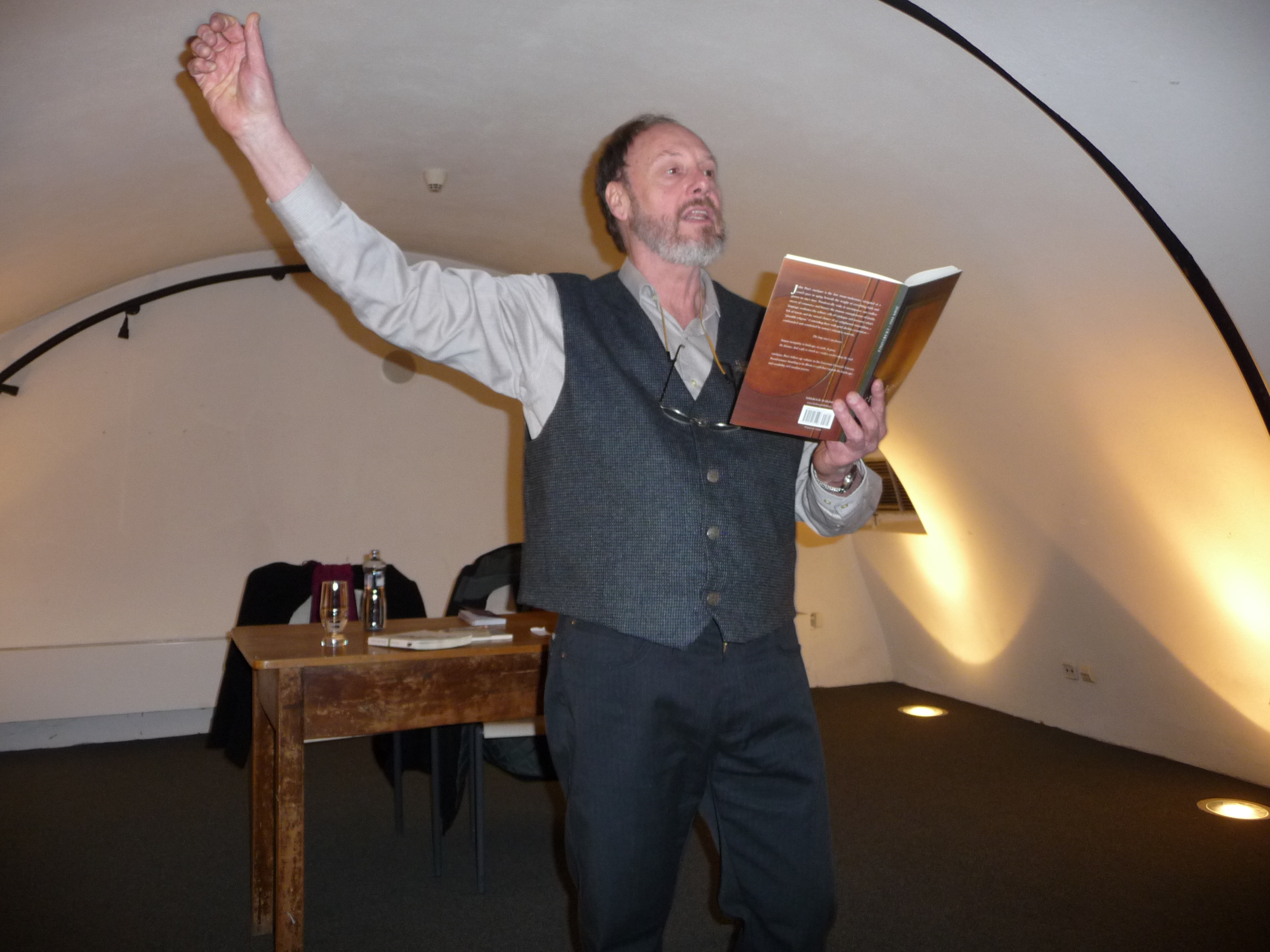 We read to a large and generous audience at Konvikt (part of Palacky University) and then went out for drinks and a light meal (slices of duck breast for me on buttered toast, and rabbit for John…). Here’s John reading: