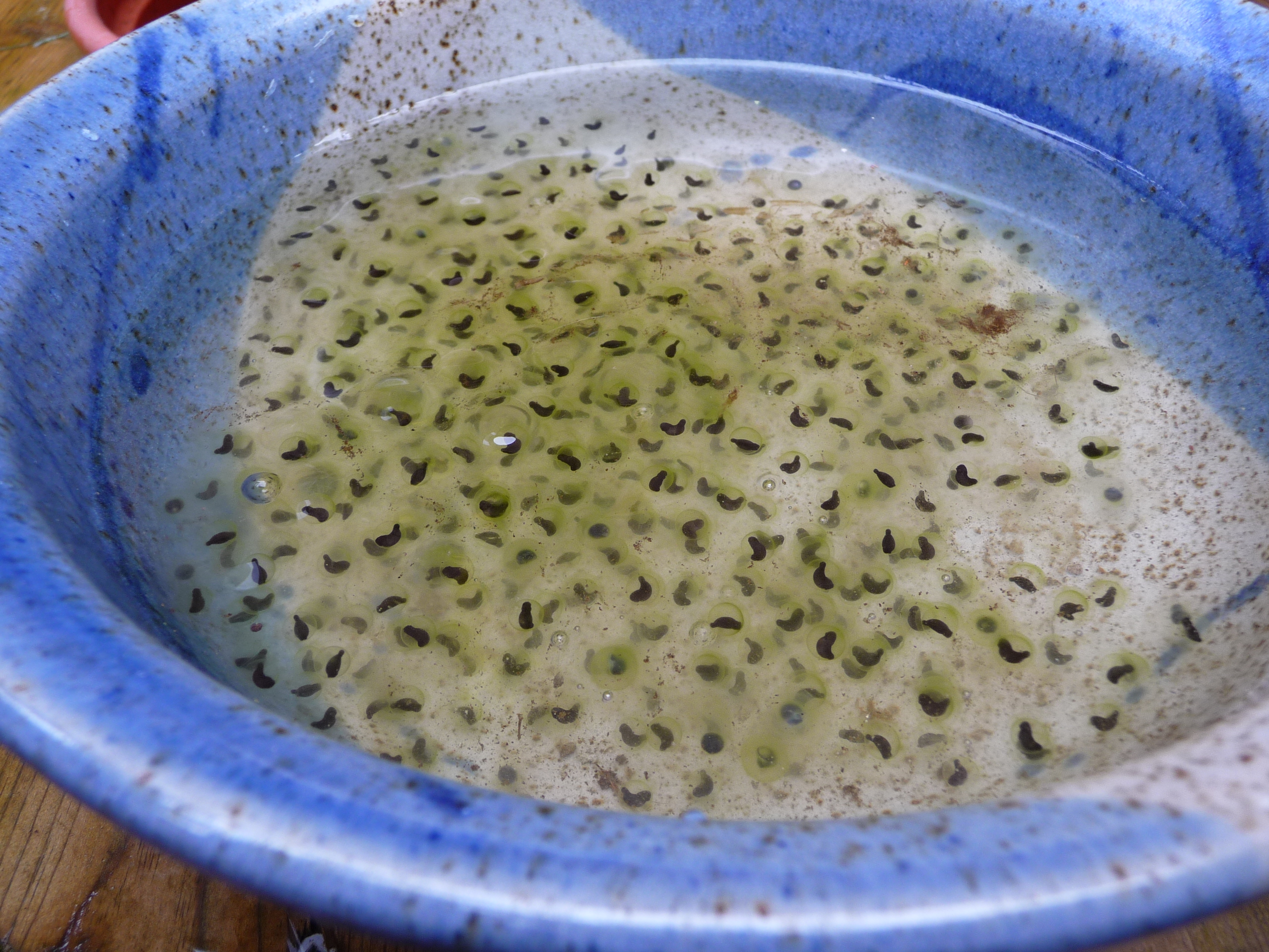 Every year I collect frog eggs to bring home to watch the process of transformation happen in a big Chinese pot on my patio and every year I’m surprised again by how mysterious and beautiful the clumps of jelly are, dotted with dark commas, hanging from a reed in the vernal pond near us. That pond dries up by mid-July and in the last few days of its water, the garter snakes glide out over the mud to the remaining pools and eat the tadpoles, many of which have their legs but haven’t yet metamorphosed to frogs. Or salamanders – because the long-toed salamanders lay their eggs in the pond too. Often a pair of mallards courts among the reeds, flying up in surprise when we pass them on our walk. And two summers ago, we saw a pair of coyotes drinking there, no doubt the parents of the juvenile who visited our garden every morning for a week, holding down salal bushes with a forepaw while it ate berries with a delicacy I didn’t expect.