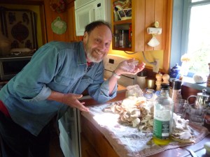 Yesterday we took our friends Jeffrey and Shana to Francis Point. On the way there, I was keeping an eye out for oyster mushrooms but didn’t see any. We sat out on the point watching a prawn boat haul in traps as an eagle hovered around, waiting for the heads. Seals kept their watchful distance. Walking back to the car, I suddenly saw two dead alder trees completely covered in mushrooms! I’d looked at those very trees earlier but the light hadn’t been right, I guess. We had bags in the car and filled two of them — IGA shopping bags! — with the nicest ones and left the mature ones there. There are also many tiny guys coming along which we’ll go for next week (unless someone else gets there first…).