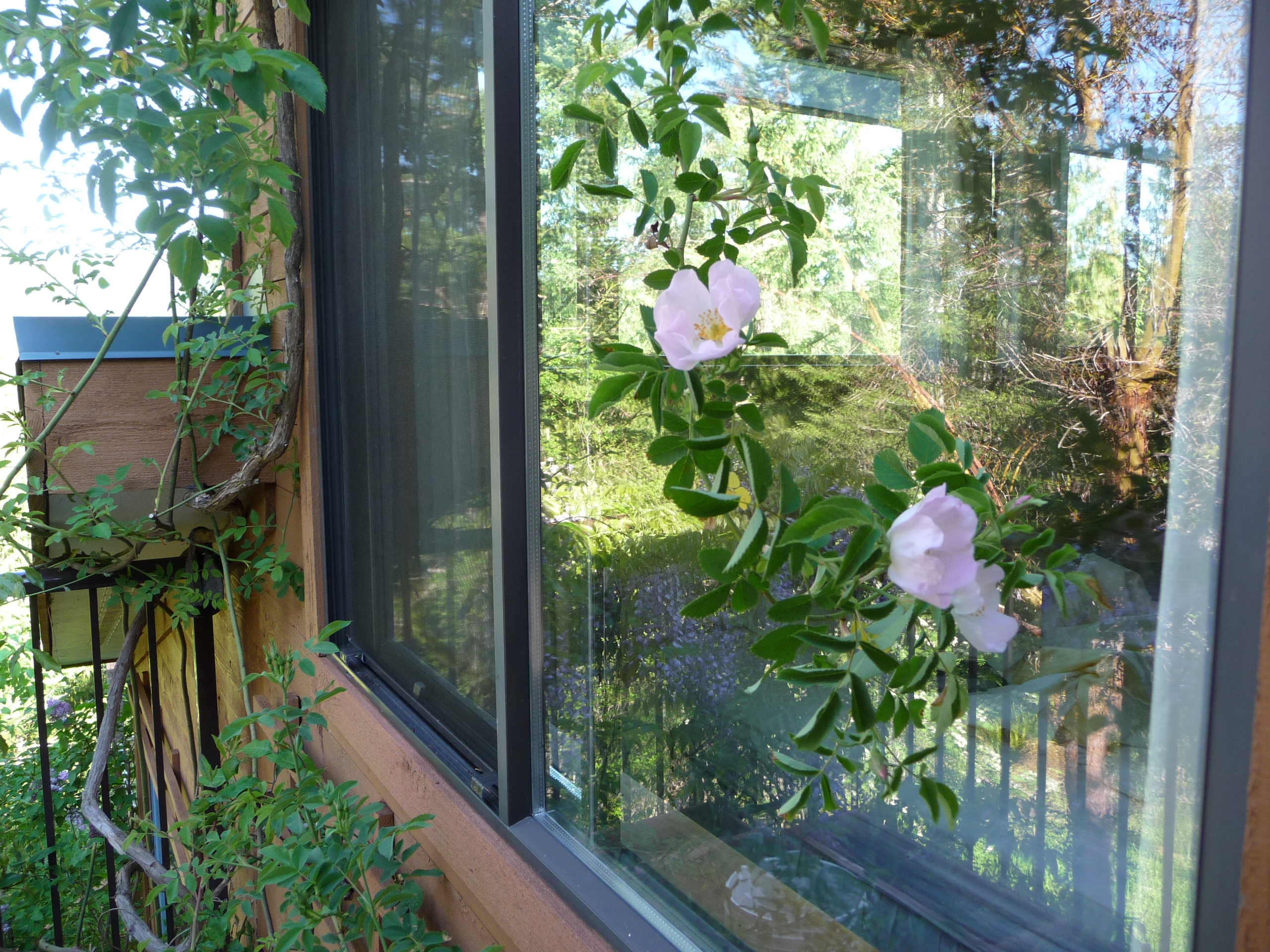 Lying in bed with my coffee this morning, I saw that the first roses were in bloom! This rose is rootstock from something which never thrived so I let it go and it’s two stories high, dense with buds. The roses are like dog roses, single, and very light pink.