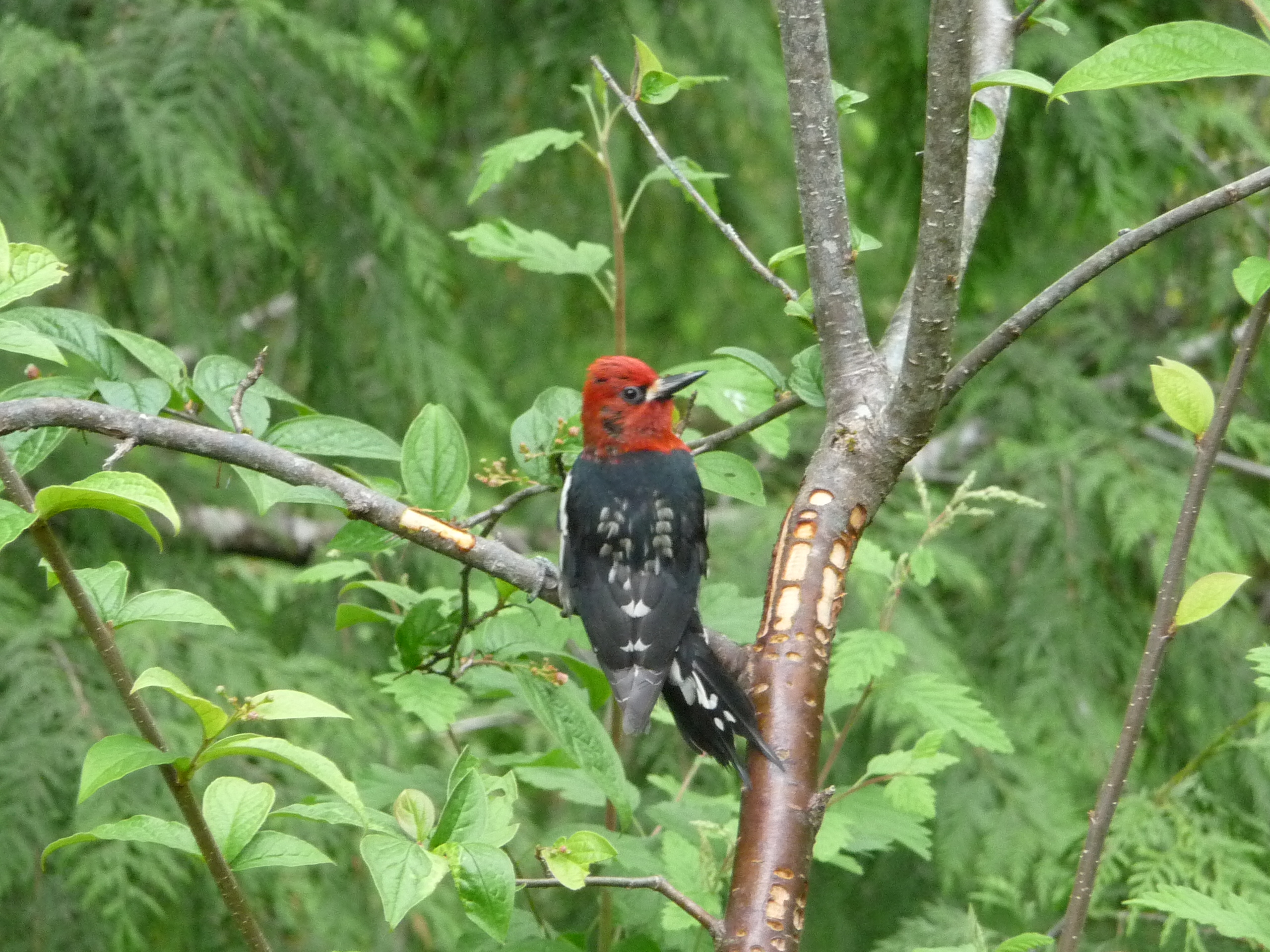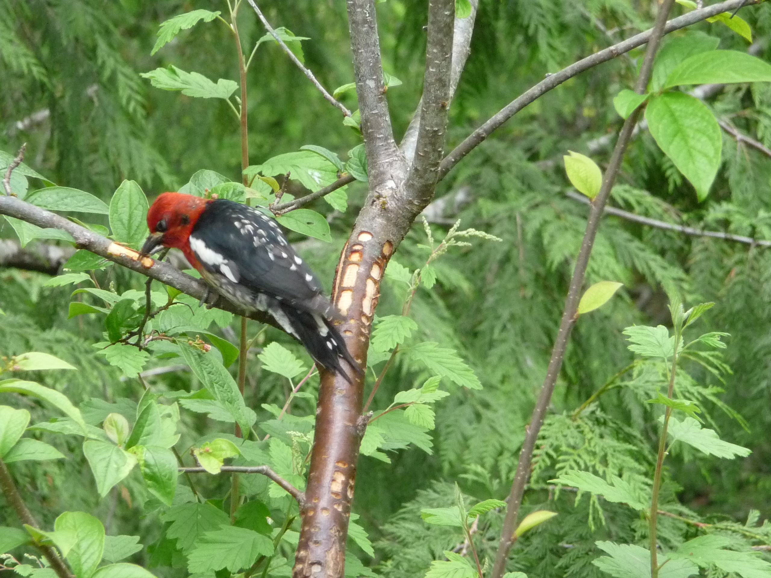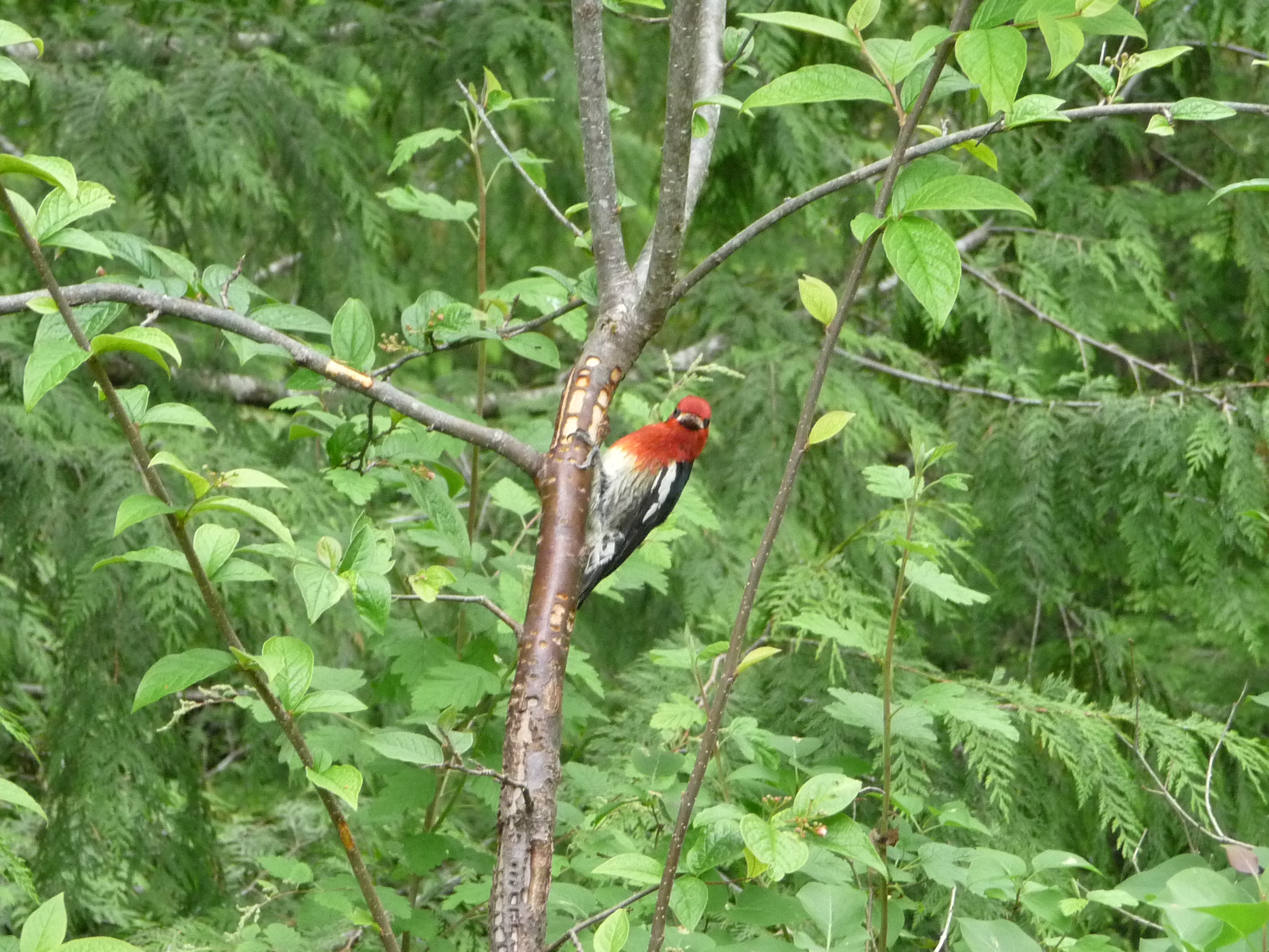 One of the nicest bird moments of the spring is realizing that the churring I’m hearing is one or more sapsuckers around the house. There have been two this past week and what I love best about them is the sense I have of their amiable adjacency — they work away at their chosen trees and don’t seem to mind us being around them. In fact they seek out trees close to the house. For years it was a mountain ash which eventually died from their attentions but then grew back from its roots. Anyway, see how this one is looking right at me while I take its portrait? It was only about six feet away from me.