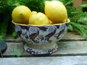 I knew it was old and I knew I wanted it. I thought it would be perfect for lemons. It was ten dollars. When I took up to the counter, the volunteer who rang it in and wrapped it in brown paper told me it had just come in that morning. It needs a good washing, she commented, but she also agreed it was pretty.