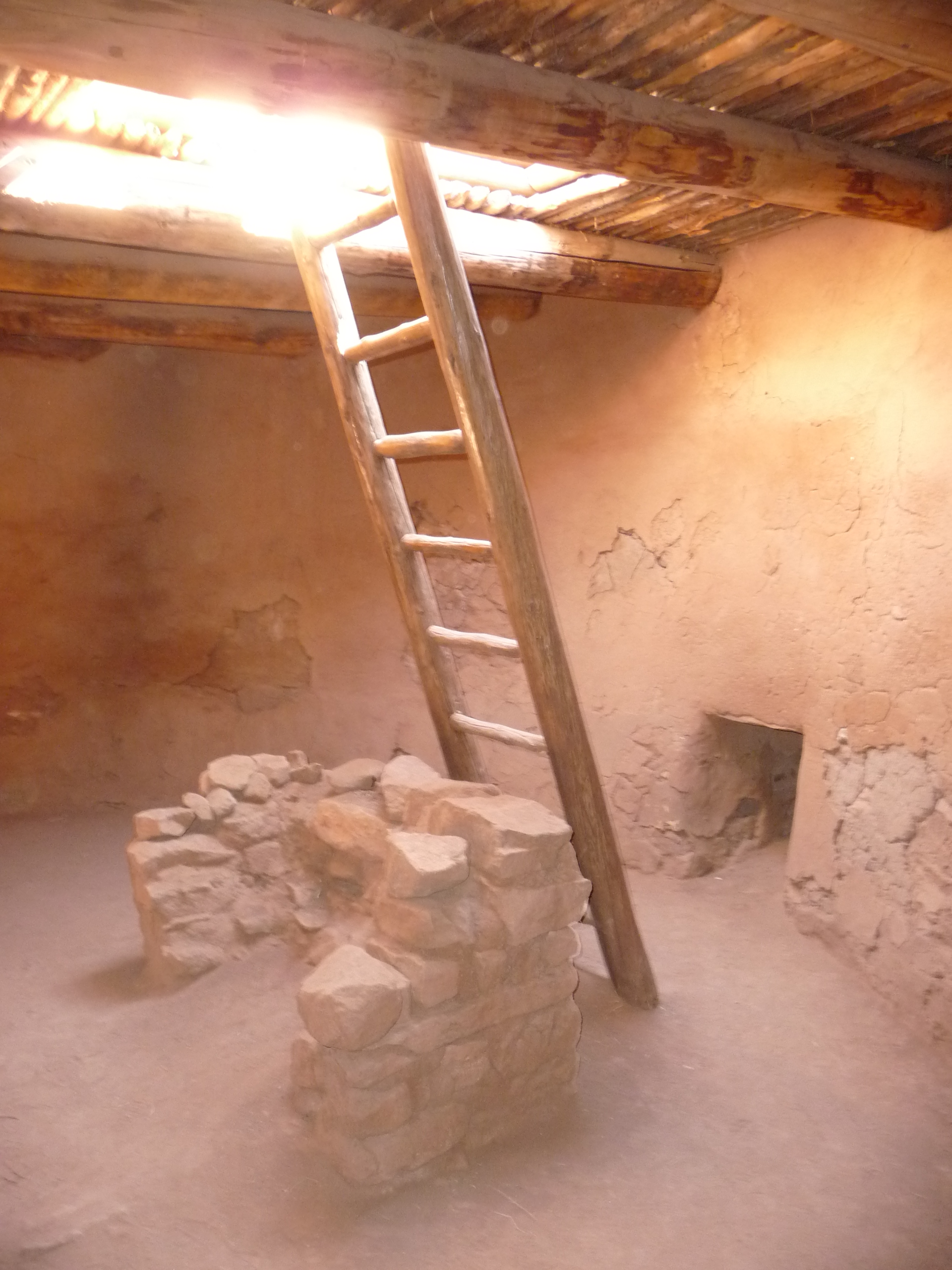 And here’s the light in one of the reconstructed kivas where we climbed down and understood why the Pueblo creation stories tell of people coming up from under the earth to live on its surface. (The kivas are still used for ceremonial purposes.)