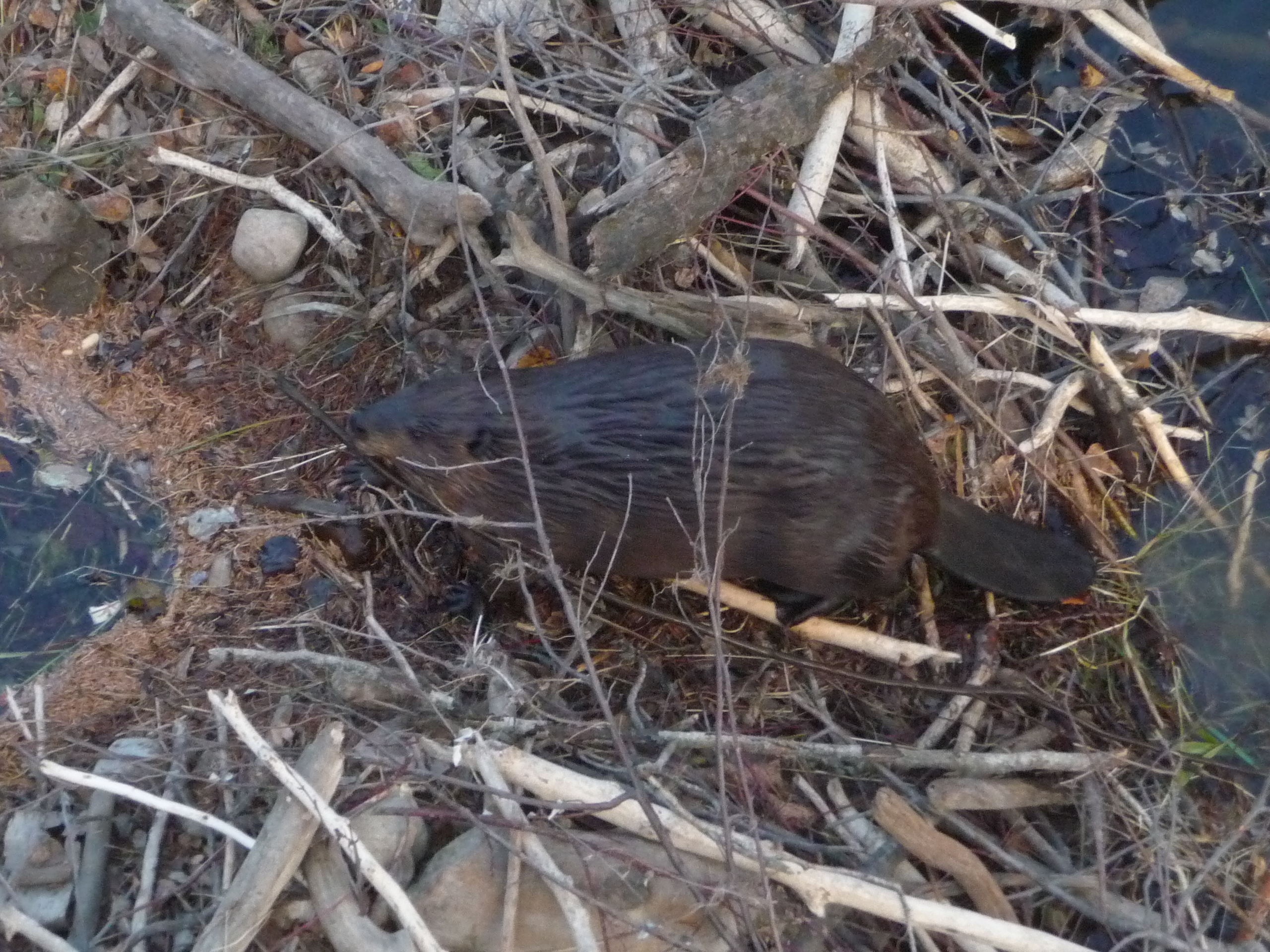 P1100592— a twilight drive (and walk) to the Whitemud ravine to watch the beavers in the colony there repair their dam and gnaw sticks: