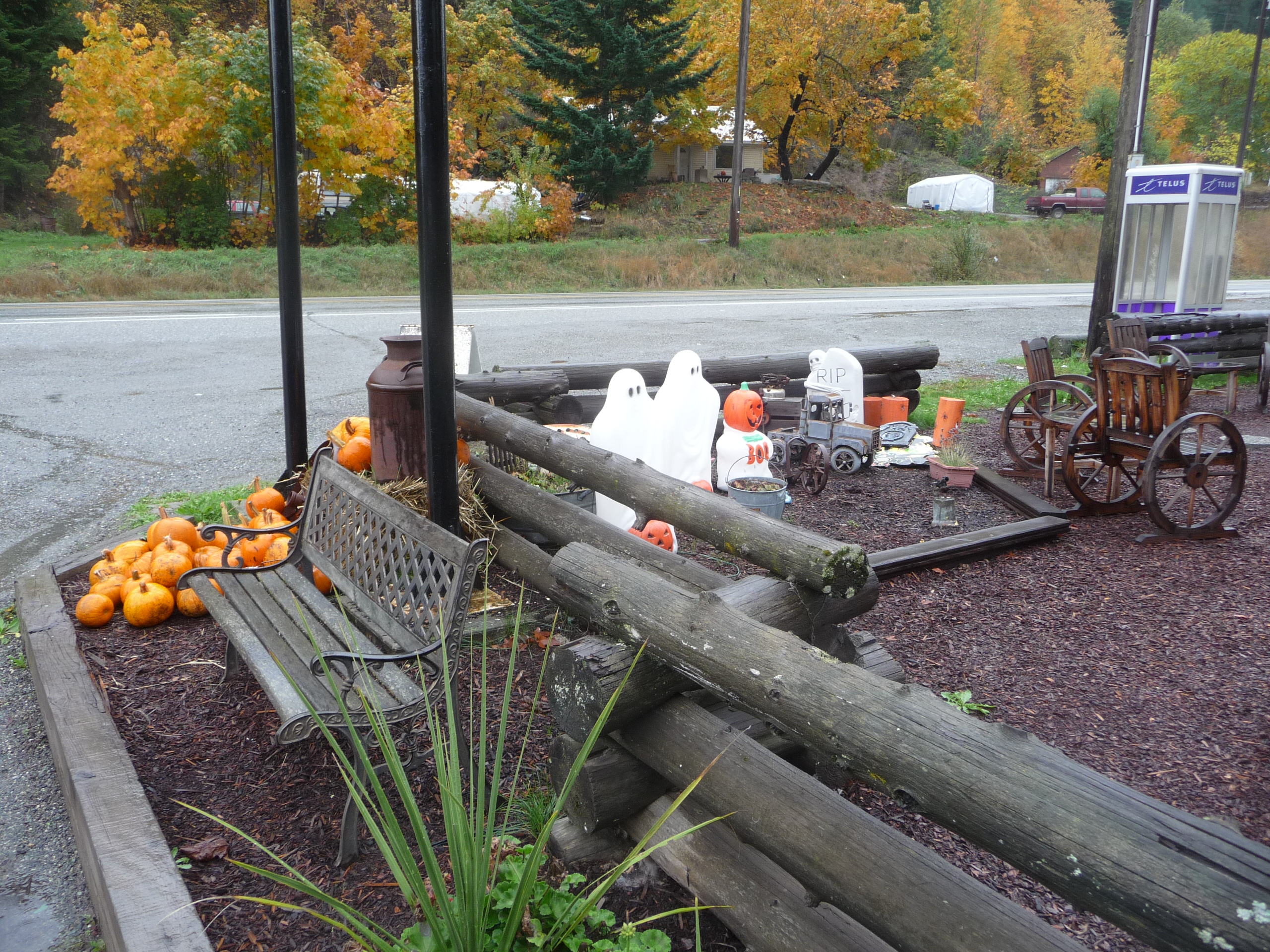 A homey interior with some antique stoves and photographs on the walls and big delicious burgers. The room was decorated for Halloween with wispy spider webs and pumpkins and a skeleton or two. And a few old ghosts from my past, Kenny Rogers singing “You picked a fine time to leave me, Lucille”, June Carter and Johnny Cash singing “Jackson” — I was in heaven. And then a green pick-up truck pulled up in front the place and a man began to unload actual ghosts. He placed them carefully in the front patio where people would sit in good weather (it was raining while we were eating our lunch):
