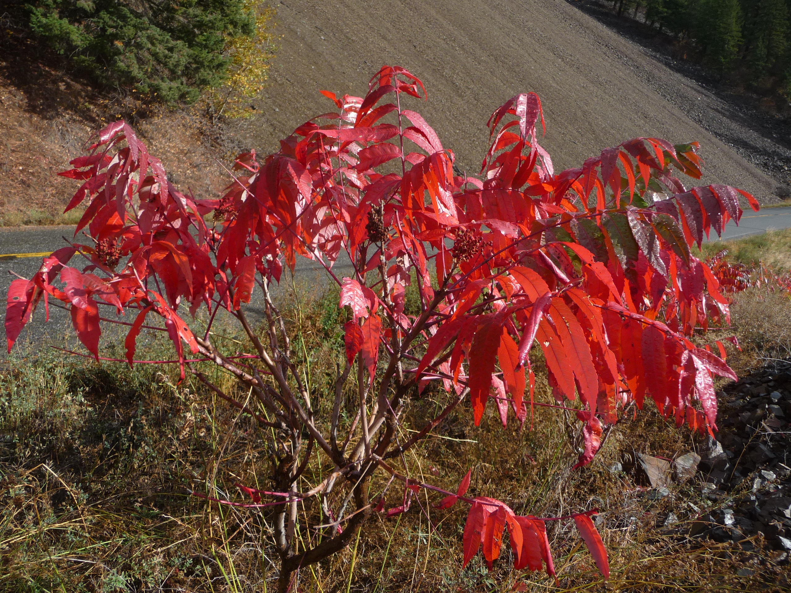 At Lytton, we crossed the point where the Thompson River enters the Fraser and wound our way along Highway 12, past old ranches and rock slopes so precarious that we recalled a slide over the summer which closed the road to traffic for some days (and now there’s a sign with Big Slide on it, to which a wag has added “Really”), past sumac almost fluorescent in its fall colour —
