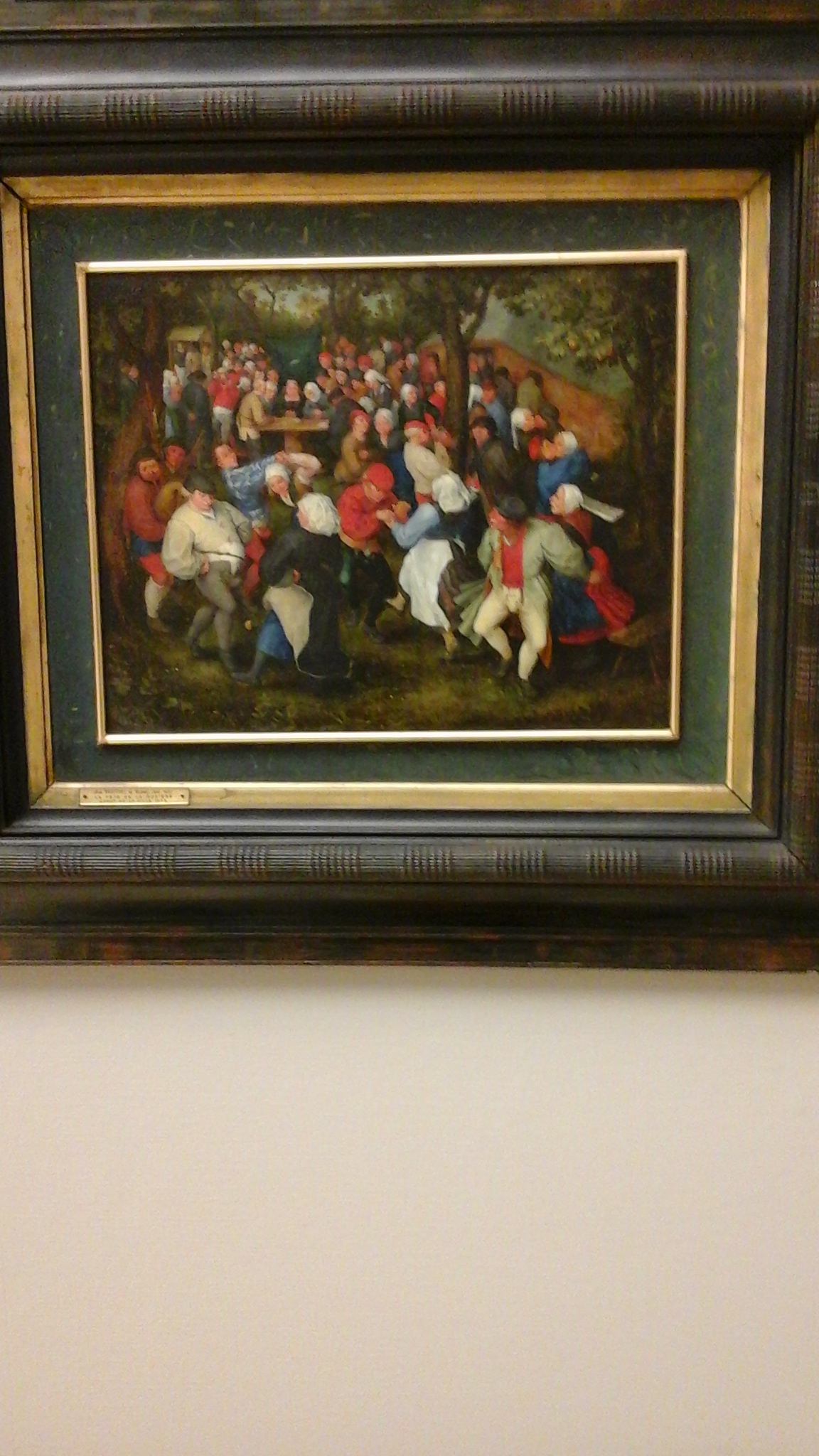 We spent a few hours at the Musee des Beaux Arts here in Bordeaux, looking at a lot of swooning maidens, dying lions, a bad Mary Cassatt (and I love her work), a muddy Bonnard (ditto), a beautiful Riopelle (his snowy owl), and an unexpected delight: Brueghel’s La Danse des Noces. It reminded me of William Carlos Williams’ late poem ‘The Dance’, in which he captures the colour and movement of a Brueghel painting.