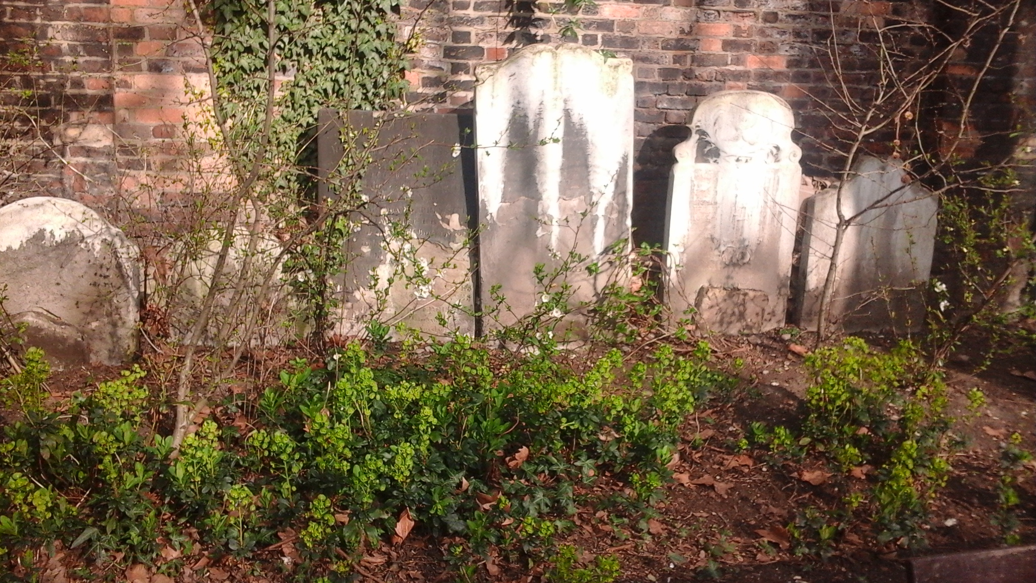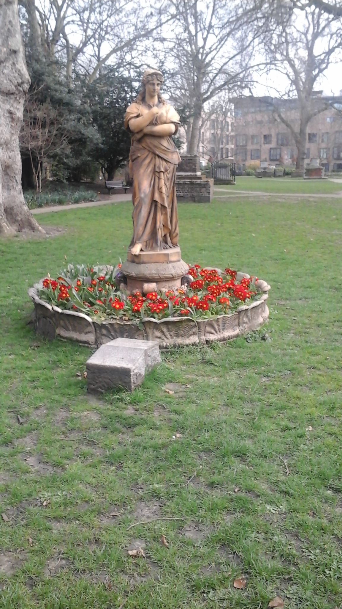 That’s where we walked this morning, a day before we fly home, to St. George’s Gardens, one of my favourite places in London. The land for it was bought in 1713 as a burial ground; it went through various stages of use and dereliction before being re-opened in the 1940s as a “public sitting room for the poor”, in the words of housing reformer Octavia Hill (from an information sign by the garden’s gate). It’s a lovely garden with private benches, magpies (we observed the courtesies seeing the first one, and then I was relieved to see its mate: one for sorrow, two for joy…), massive plantings of hellebores, daffodils, a statue of Euterpe (the muse of lyric poetry),