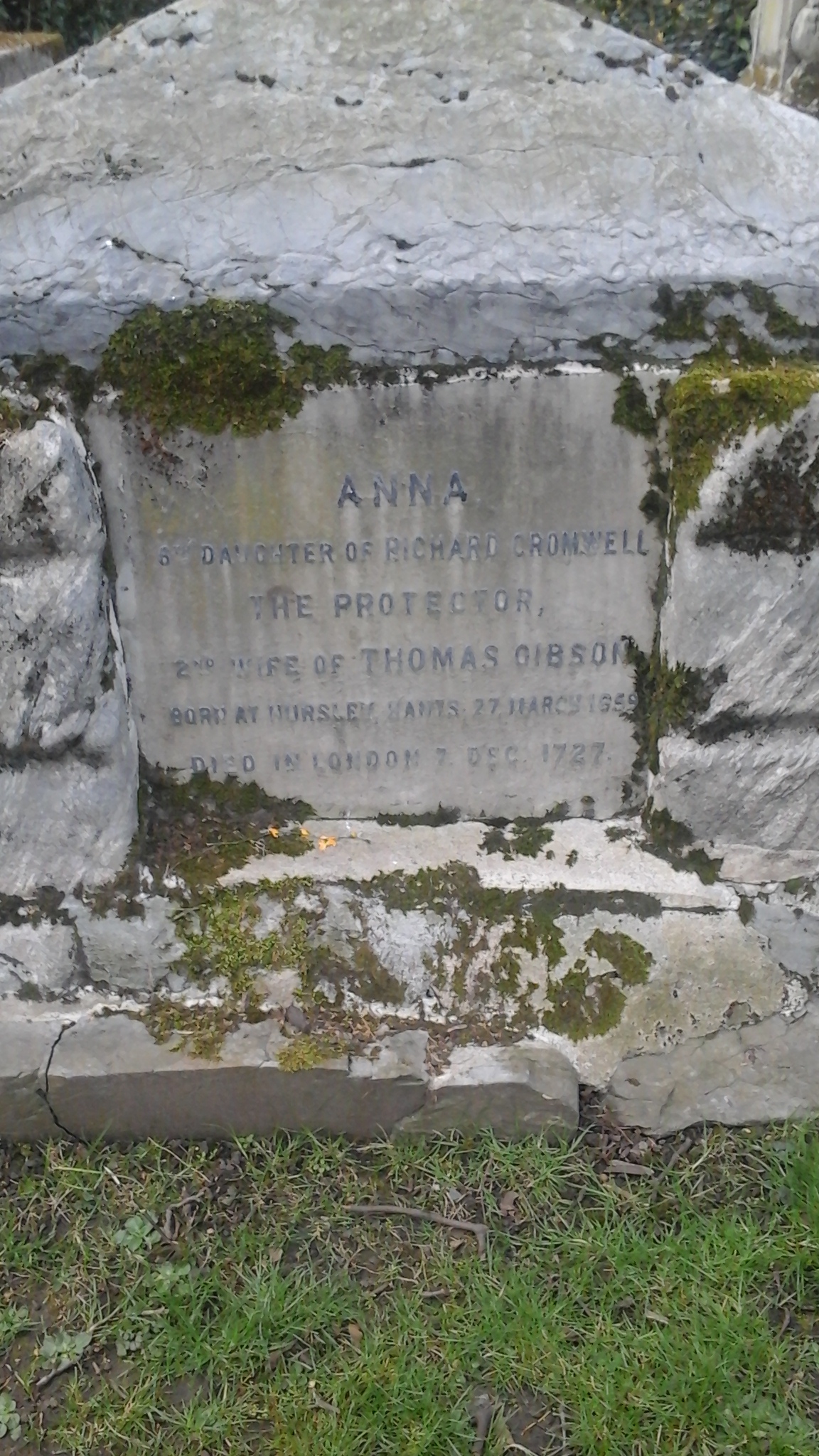 Here is the grave of Anna Gibson, granddaughter of Oliver Cromwell, related (in some way; kinship maps always baffle me) to Thomas Cromwell, subject of the wonderful Wolf Hall: