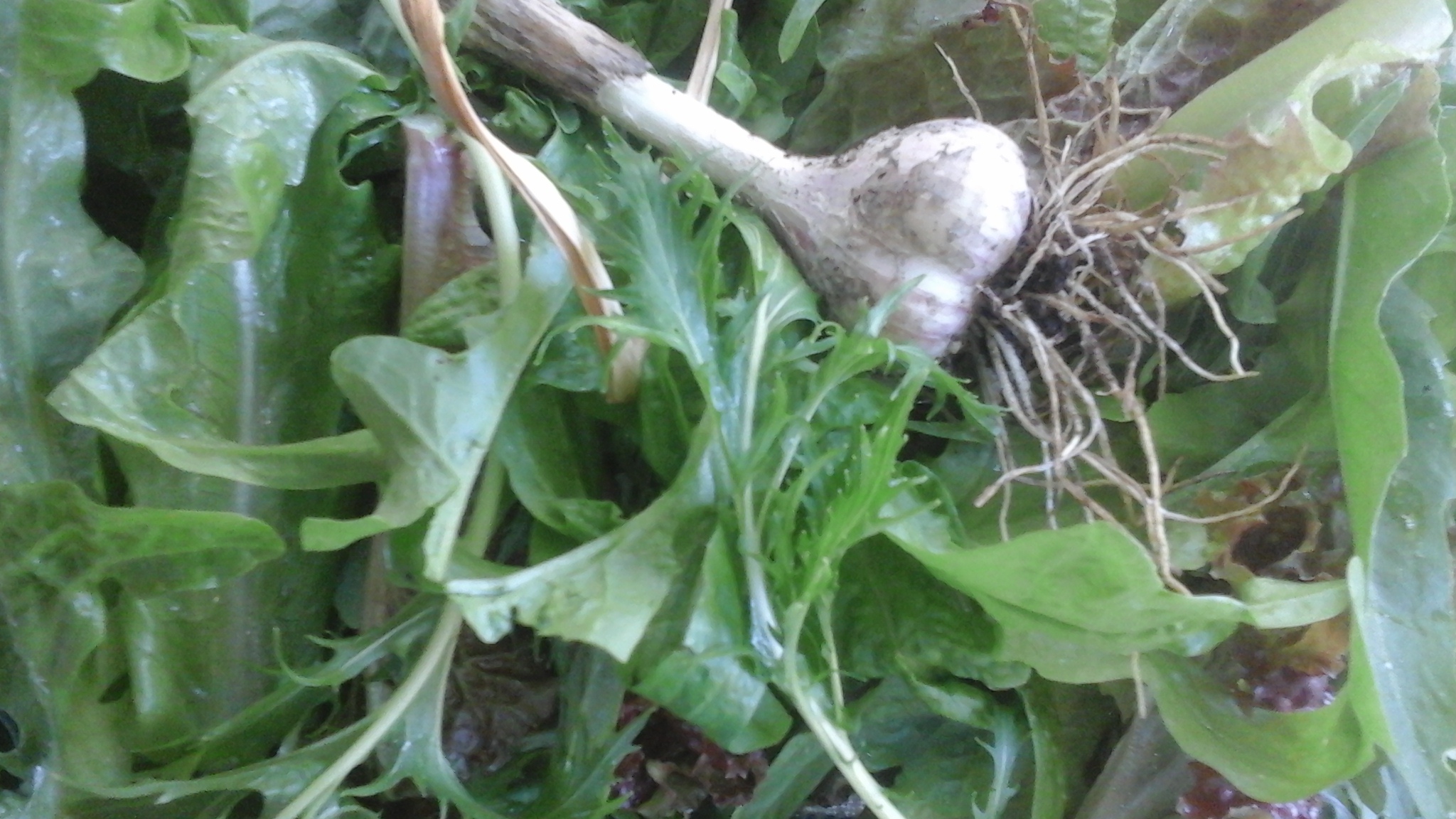 By noon, the lettuces are too limp with heat to pick. So I’ve been going out in the morning to gather a big colander of salad to have later in the day. It’s too hot for much more than greens at lunch and dinner, though yesterday’s sockeye, barbequed in the early afternoon when the patio was cool and eaten in the evening with dill and chives (and salad) is one option. So today’s picking — red lettuce (the butter lettuces went bitter in the heat and are now in the compost), arugula, and the volunteer catalogna lettuces which seem to thrive in summer; and then I wondered if the garlic was ready to pick too, three weeks early. And it is.