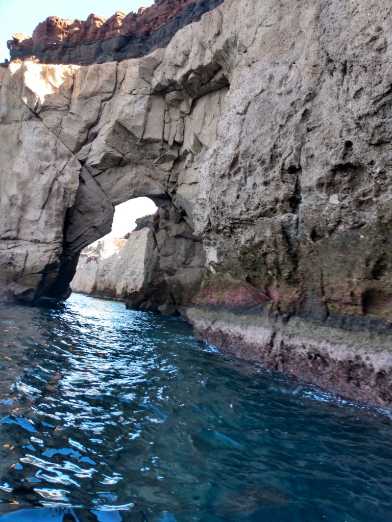 …passing through this arch in a boat, after the nesting area where hundreds, thousands of pelicans, yellow-legged gulls, blue-footed boobies, magnificent frigate birds (some of the males still sporting their red gular pouches), imagine hearing and smelling the 700 California sea lions before you saw them, on rocks and in water,