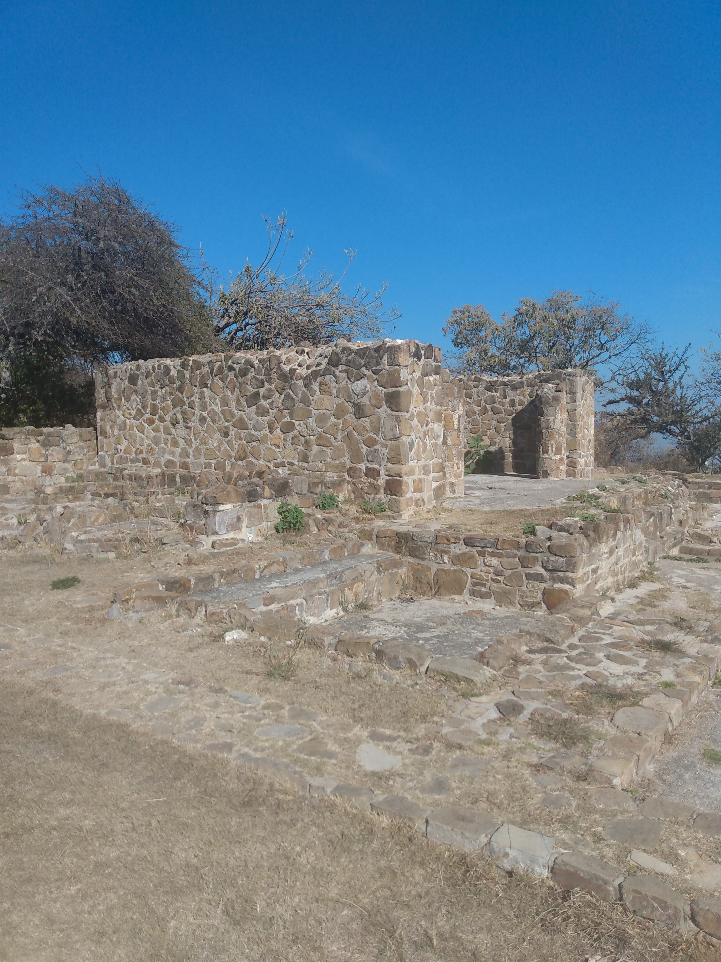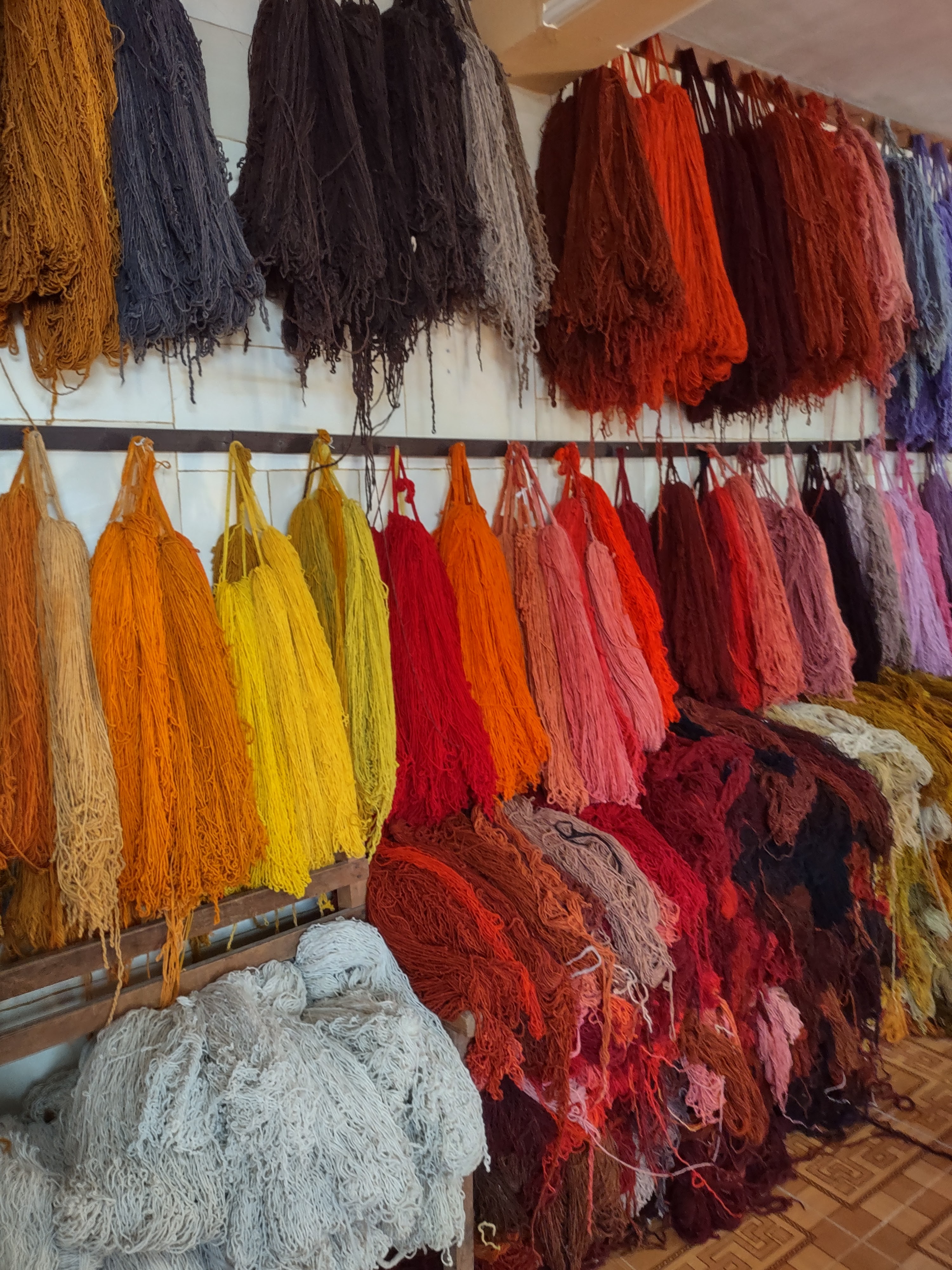 Yesterday we visited the extraordinary site at Monte Alban, a place shimmering with power. From there we drove to Teolitlan Del Valle to meet Oscar Perez and his family. Oscar greeted us in Zapotec with a little glass of mezcal. I was in heaven as he showed us the process of his work with wool, from fleeces, which he carded and spun into yarn, then immersed in dyes made with rock lichens, calendula, cochineal–he had cactus paddles with the parasitic bugs on them and he crushed a bug in my palm to release its brilliant red, a colour that can be changed by the addition of lemon, soda; on my palm, a Zapotec tattoo–, indigo leaves, pomegranates, pecan shells. Oh the colours! In a courtyard, the dye vats.