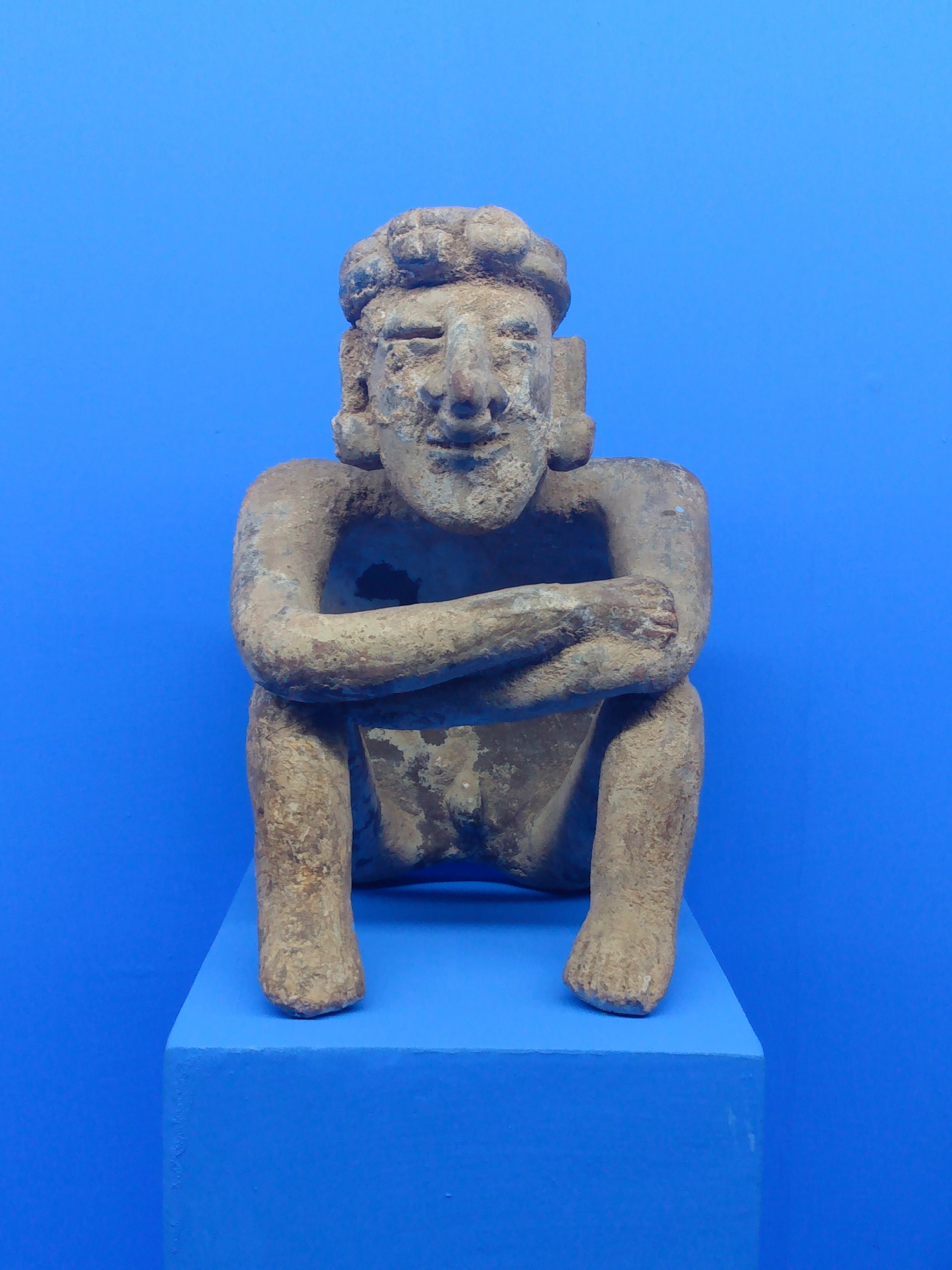 Around the block is the Museo de Arte Prehispanico de Mexico, showcasing the collection of Rufino Tamayo. Each gallery is beautiful, the work displayed in cases painted deep pink or violet or ultramarine or saffron or clear green. So many astonishing creations, from 1260 BC to 200 AD, and then later, until 1521. I loved the polychrome vessels, the dogs, the women. Look at this philosopher!