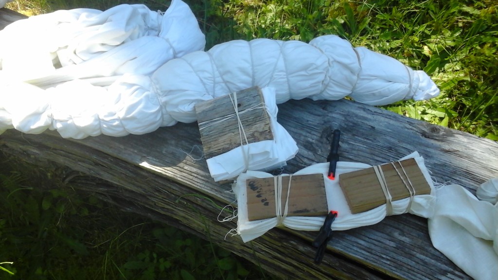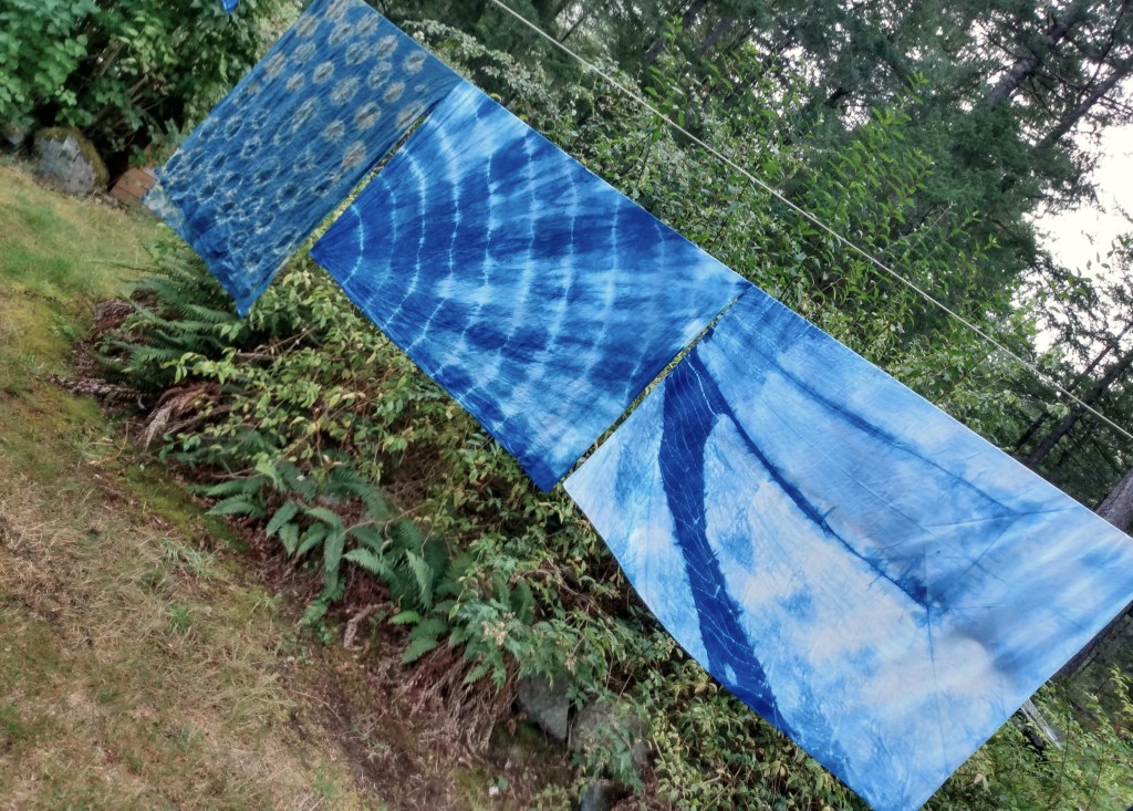 If it ever stops raining, I’m going to begin planning my outdoor dye workshop. We have a deck off our utility room with PVC panels over part of it. Our hot tub was there for years (bought with some of the money from John’s Governor General’s award in 2006). It was one of the soft tubs, one we could move around if we needed to (when it was emptied of water), and it was wonderful. Then then it stopped working. We had it repaired. And then it stopped again and couldn’t be repaired. So it’s gone. But the deck remains. When I’ve done indigo dye work in the past, I’ve used a long cedar bench out by my vegetable garden: