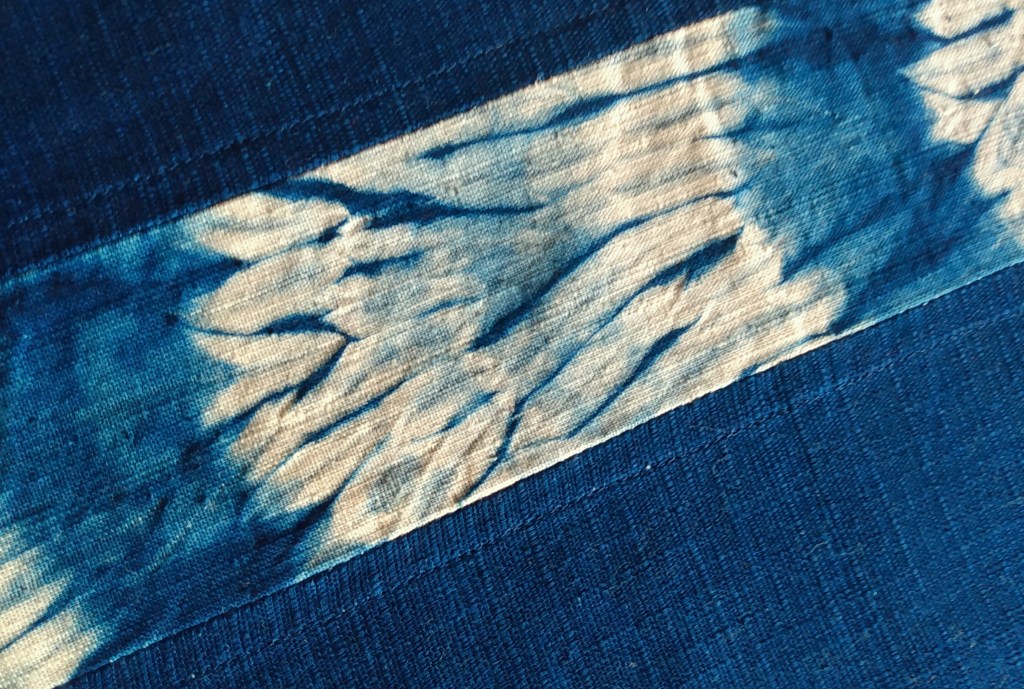 After a winter storm, some long branches of a tall mahonia in our garden broke, and I’m saving the leaves and bark for a dye vat. I’ll collect some rock lichens too. John’s said he’ll make me some long benches and I’ll work out racks. I’m keeping my eye open for a big pot at the thrift store and I’m saving the 2 litre jars olives come in. One I’ll partly fill with old nuts and bolts and other worn-out hardware, for iron mordant. Maybe I’ll save pee for another. On our dining table, there’s a block printed Indian cloth, deep blue, though probably dyed with an aniline dye. And down the centre of the table, over the cloth, is a runner a friend gave me. She bought it in Japan. It’s indigo-dyed, outer lengths of linen with a shibori-dyed panel within. It’s beautiful enough to stop me in my tracks when I come into the kitchen. Linen takes dye so well and I have some lengths in my fabric trunk. I’m trying to source some more, and some silk. Rose madder scarves, with indigo borders? A marigold duvet cover? And something special, silk or linen, for cochineal. Just thinking about this sends my heart-rate up. I can’t wait.