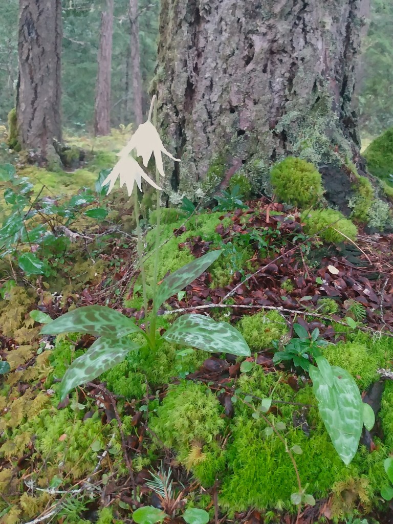 I imagined the lilies holding the moon’s light like crucibles. I didn’t go out. I returned to bed and thought about the things I’ve stopped noticing. These lilies are not wild, though you aren’t wrong if you’re thinking they’re our native Erythronium oregonum, or fawn lily. They’re a cultivar, though I’ve forgotten which one. I’ve never found the wild fawn lilies on our land but they do grow nearby, at Francis Point and Smuggler’s Cove. The pink form, E. revolutum, grows in abundance at the Oyster River estuary near Campbell River on Vancouver Island and every time we’ve been in the area this time of year we’ve stopped to walk the estuary trail to take photographs. There are masses of them, and lots of trilliums too.