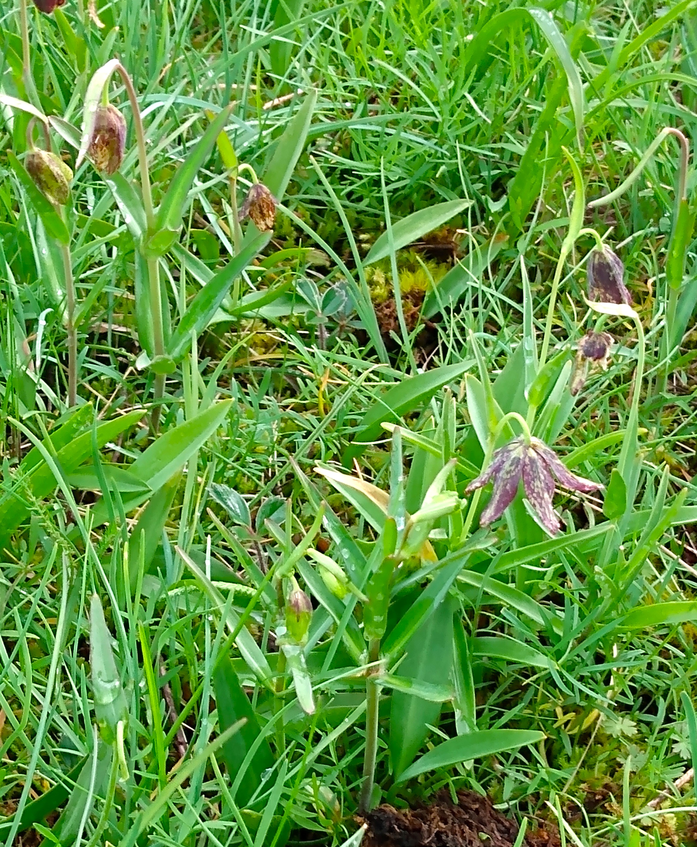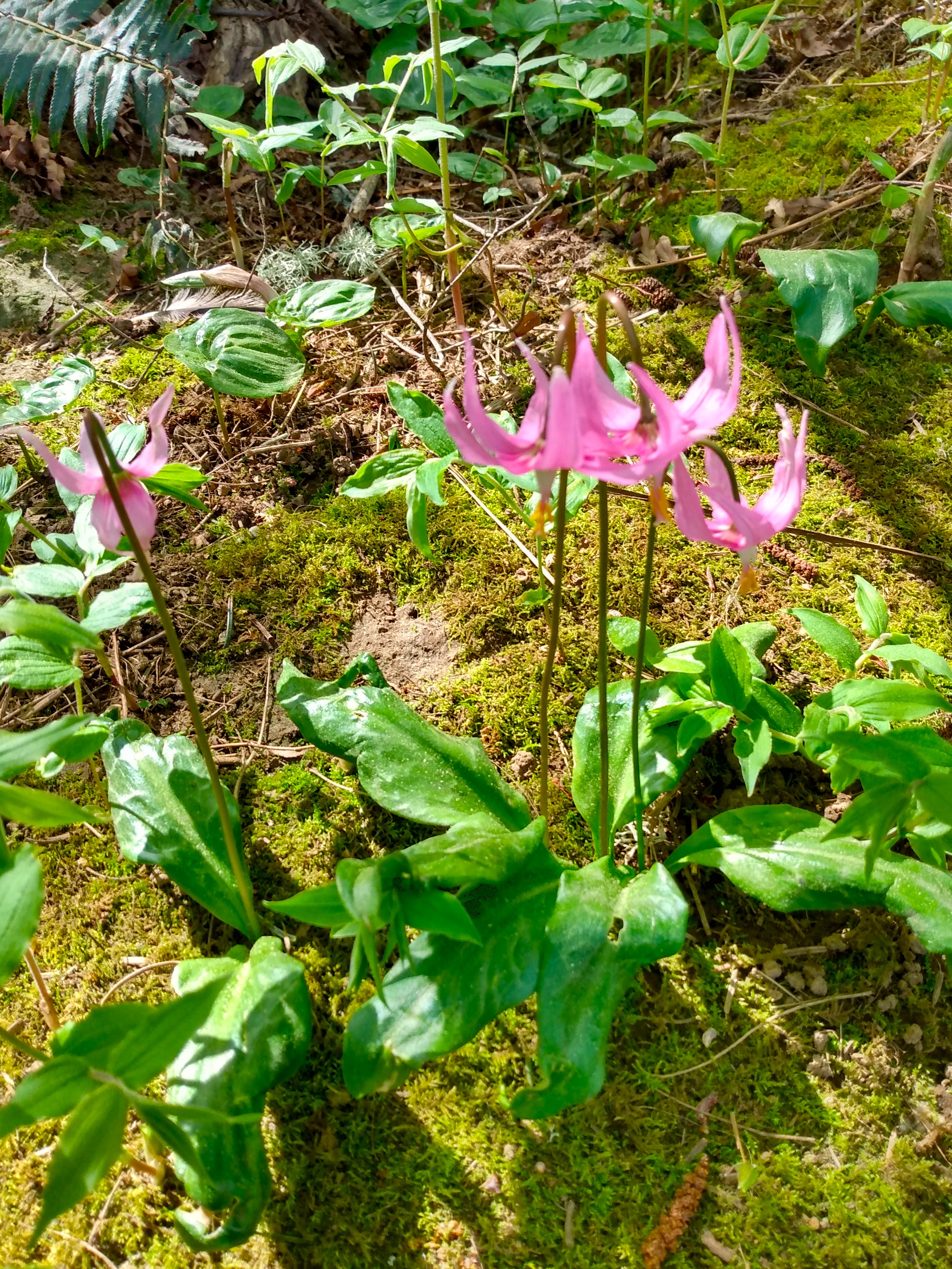 I saw these pink lilies as we drove to Campbell River to begin a week’s adventure exploring the Discovery Islands. It was mid-April, 2024. On our last day, we stopped at a little island that was covered with chocolate lilies (Fritillaria affinis), death camas (Zigadenus venenosus), and nodding onions (Allium cernuum), all of them in bloom and bees hovering over them as we stepped carefully through the grass.