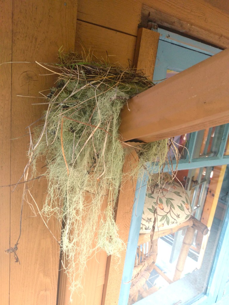 You can’t see the perfect bowl, ready for eggs, but you can see the casual drape of lichen (and the little raw area above the blue window where the bear tore off the trim last weekend when we were in Kamloops for a few days). We used to have robins nesting around our house, on angles of grapevines under eaves, above a window in the printshop, on a beam carrying wisteria over the patio, and once on a railing by our front door. We’d stop using those doors and windows, delighting in the care the parents took as they kept the eggs warm, then the nestlings fed, then, when we were lucky, we’d see the young leaving the nest, encouraged by their parents perched in nearby lilacs.