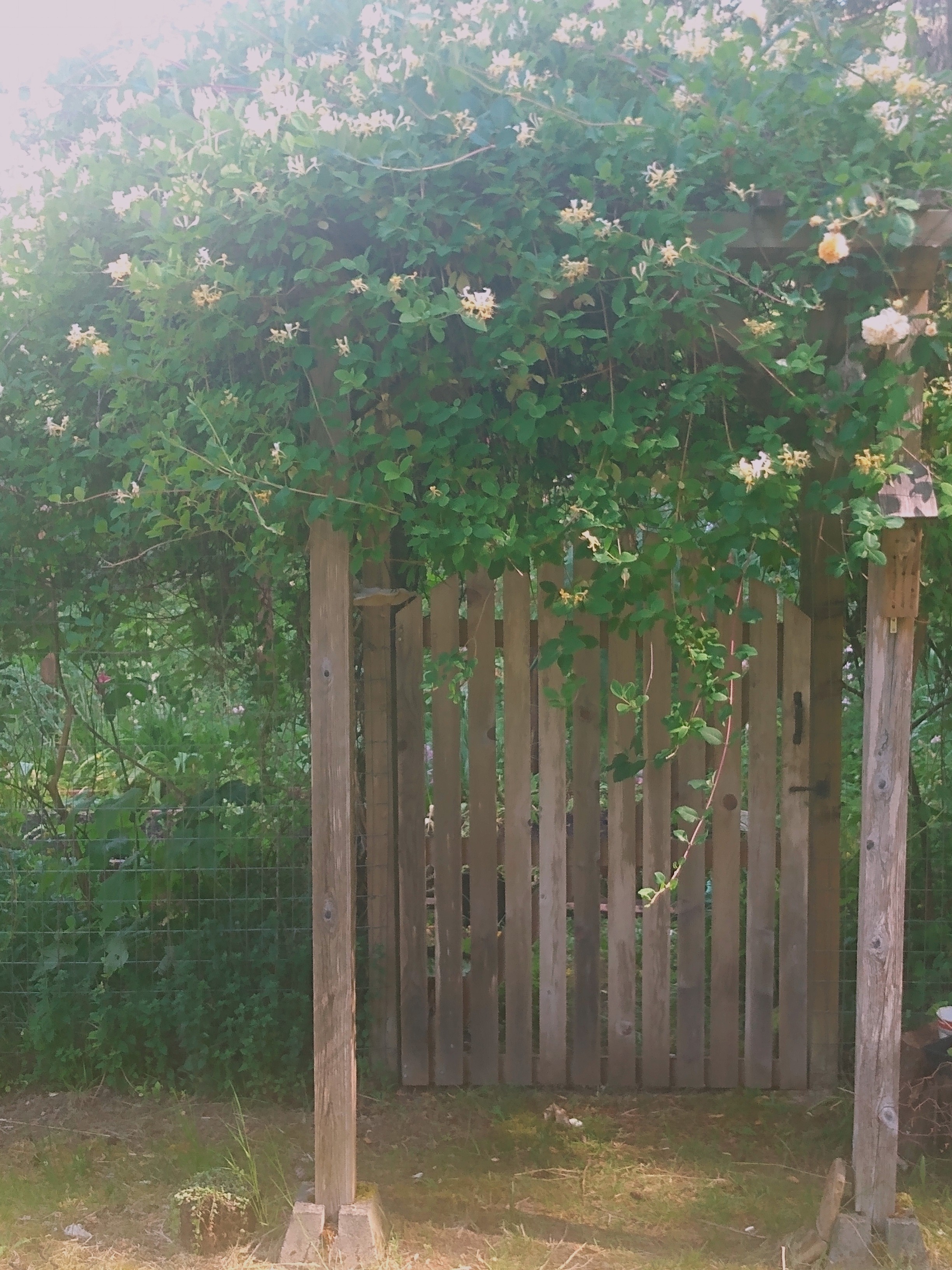 Around the garden gate, the honeysuckle is in full bloom, bees humming, a thicket of sweetness. The unnamed apricot roses find their own way through. And just to one side, the deep pink moss roses have covered the fence.