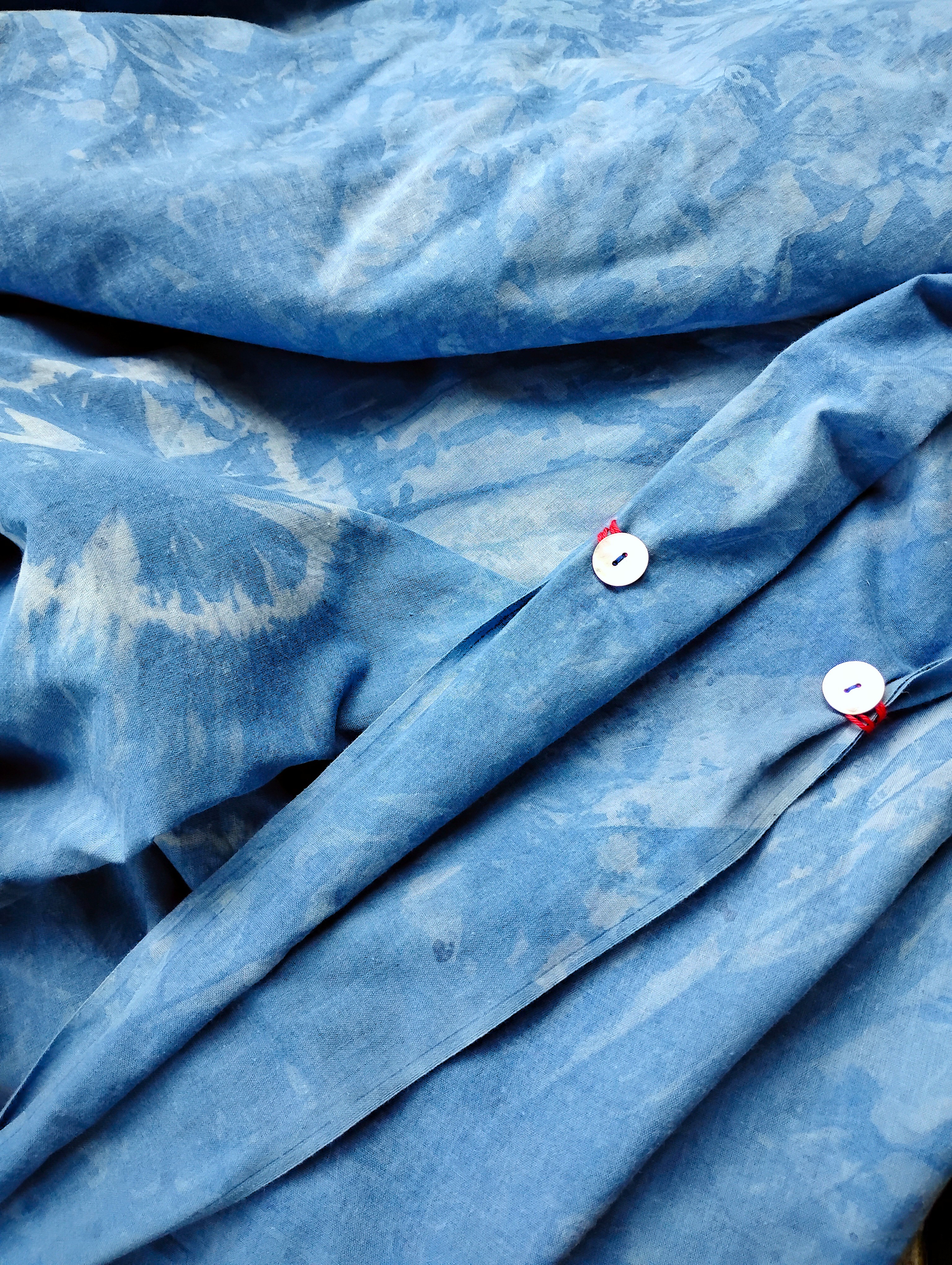 This morning, one of my last fall swims, the sky so blue overhead, a few contrails, one cloud. One of my last fall swims. At home, a new quilt in progress, the layers basted together. Two weeks ago, for my daughter’s birthday, I sent a duvet cover I’d dyed, sewn, finished with shell buttons fastened with red thread. Time to pull out the winter blankets, the warm coats, though the sun is shining. How cold the water was as I swam my lengths, arms reaching forward, then back, my torso not quite straight. One of my last.
