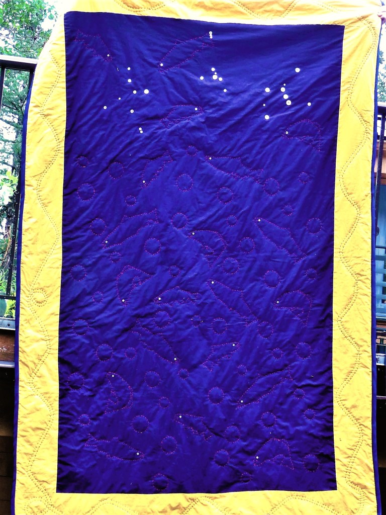 It’s been damp lately, skies muzzy with cloud. Orion has always been his constellation, hovering over him as a young boy buying his first bow, learning the tension, the release of the arrow. I made this quilt for a grandson 7 years ago when he was turning 3, a swirl of autumn salmon, shell buttons for eyes and for the constellations present in our western sky on the night of his eastern birth crowning the top: Cygnus, Cassiopeia, and Orion. Still in the sky, as another birthday is celebrated.