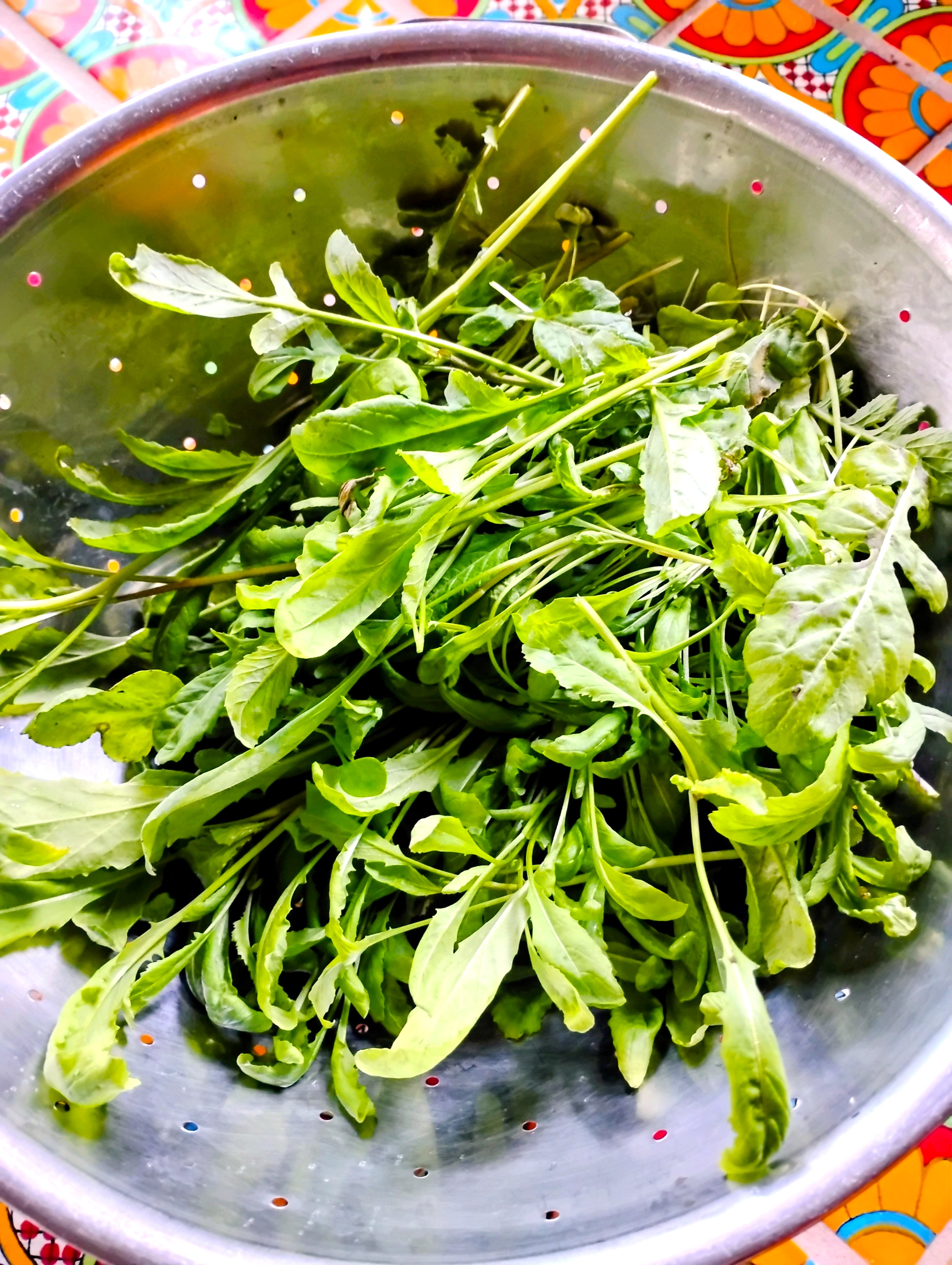 The little moments in the greenhouse: tulips and daffodils coming up, a few crocus in big tubs by the door, dappled cyclamen leaves, the green scent of overwintering olives, and the pleasure of cutting salad — arugula and miners lettuce — for our Valentine supper.