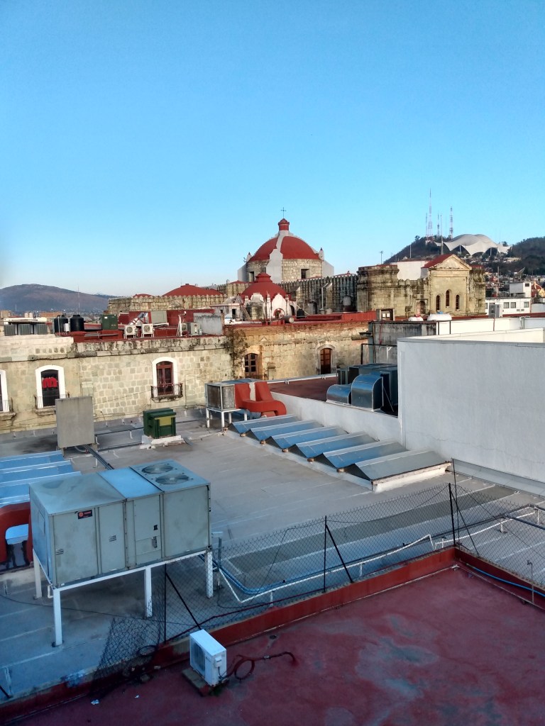 Yesterday we visited the extraordinary site at Monte Alban, a place shimmering with power. From there we drove to Teolitlan Del Valle to meet Oscar Perez and his family. Oscar greeted us in Zapotec with a little glass of mezcal. I was in heaven as he showed us the process of his work with wool, from fleeces, which he carded and spun into yarn, then immersed in dyes made with rock lichens, calendula, cochineal–he had cactus paddles with the parasitic bugs on them and he crushed a bug in my palm to release its brilliant red, a colour that can be changed by the addition of lemon, soda; on my palm, a Zapotec tattoo–, indigo leaves, pomegranates, pecan shells. Oh the colours! In a courtyard, the dye vats.