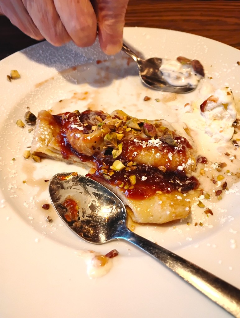 Last evening we went to the Backeddy for an early supper. We’d been down the Coast all day, on errands, and how nice it was to sit by the windows, looking out at the Inlet where the light was fading. Ruby said there’d been whales earlier in the day which reminded me that the last time we were here, Saoirse said there’d been whales that day as well. Instead of whales, we saw gulls on the dock, so many of them, gossiping as the light fell. Ruby brought a sample of the dessert special for us to try, a crepe, with gorgeous compote made of plums from old Egmont, across the Inlet.