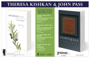 We’d originally hoped to read together but then it seemed that my new book, Mnemonic: A Book of Trees, wouldn’t arrive until late in October. I’m entirely happy to be part of the audiences along the way, listening to John read from crawlspace, and meeting new friends and old. As it turns out, my book is winging its way to me as I write this and so there may be an opportunity to introduce it and perhaps even sell copies to anyone who is interested in having one hot off the press. (For a sneak peek, visit this link to the book on Goose Lane Edition’s website: http://www.gooselane.com/book.php?isbn=9780864926517)