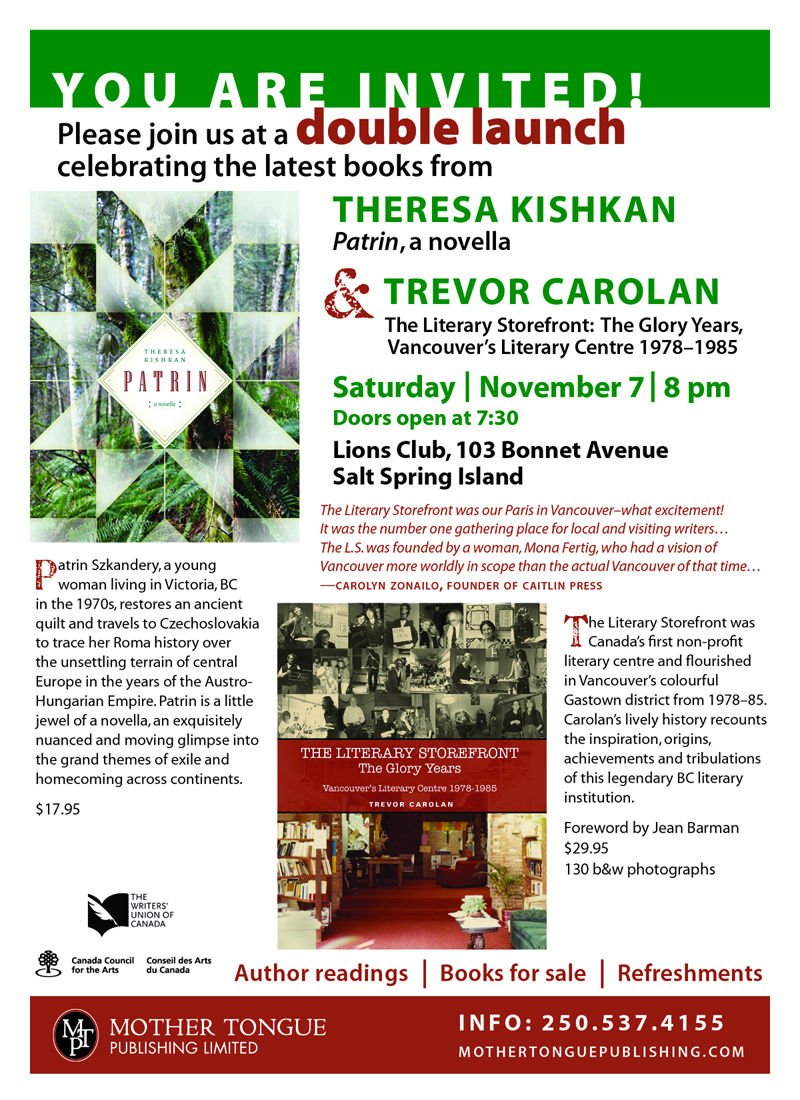 I’d like to extend an invitation to readers to attend the book launch for Mnemonic on November 8 at the Arts Centre in Sechelt at 7 p.m.