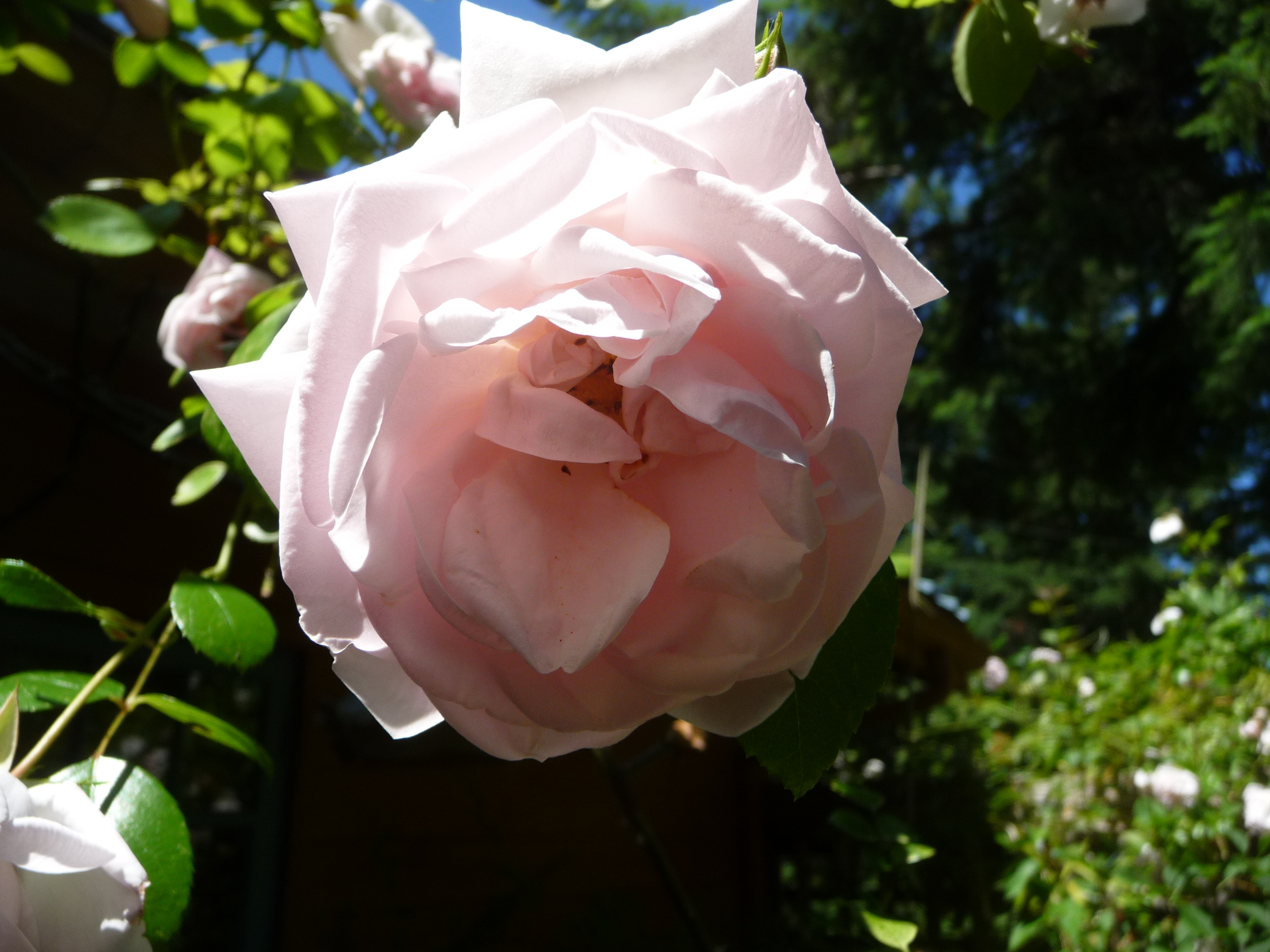 Another rose grows up the railings just beyond the kitchen. It came from a spring plant sale decades ago, unnamed, but when I was writing one of the essays in Euclid’s Orchard, I got out my big dictionary of roses and kept turning the pages until I found it. Did it matter? Would it be any less (more) beautiful named than unnamed?