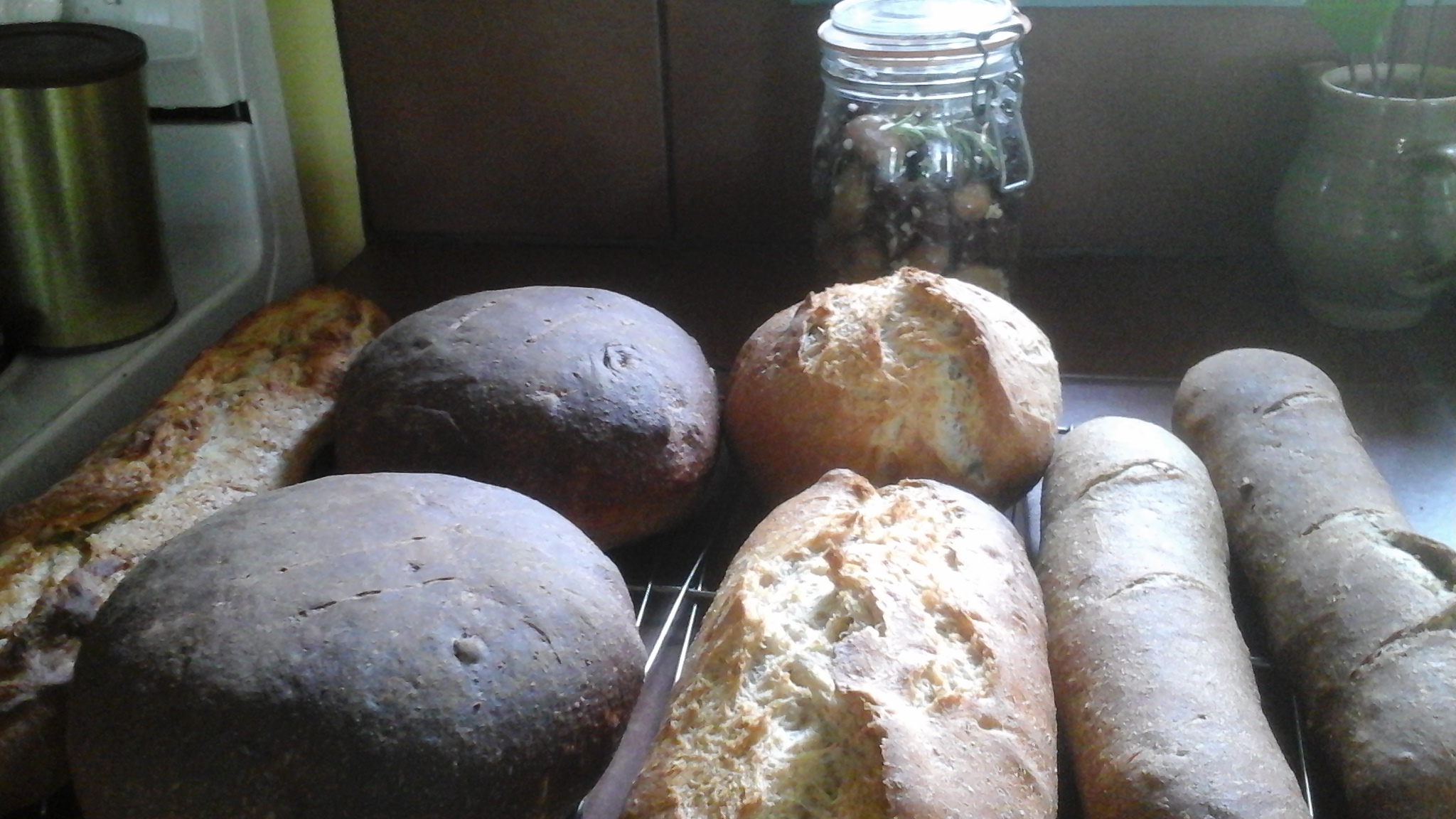 But the bread, I see this now, was such an accomplishment. I make two loaves a week, enough for my husband’s morning toast, and to accompany the occasional meal of omelette or soup. When my children come home for a holiday, I make it more often – one son has been known to eat most of a loaf warm from the oven, with butter and cheddar cheese. And I use my Kitchenaid to mix the dough, removing it at the end to give it a few nostalgic turns with my hands. I didn’t always use the Kitchenaid (I’ve only had it for five or six years) and know something of the work of kneading larger quantities of dough but I never made 12 loaves at a time. But the point (or one of them) is, it’s no effort at all to make bread this way.