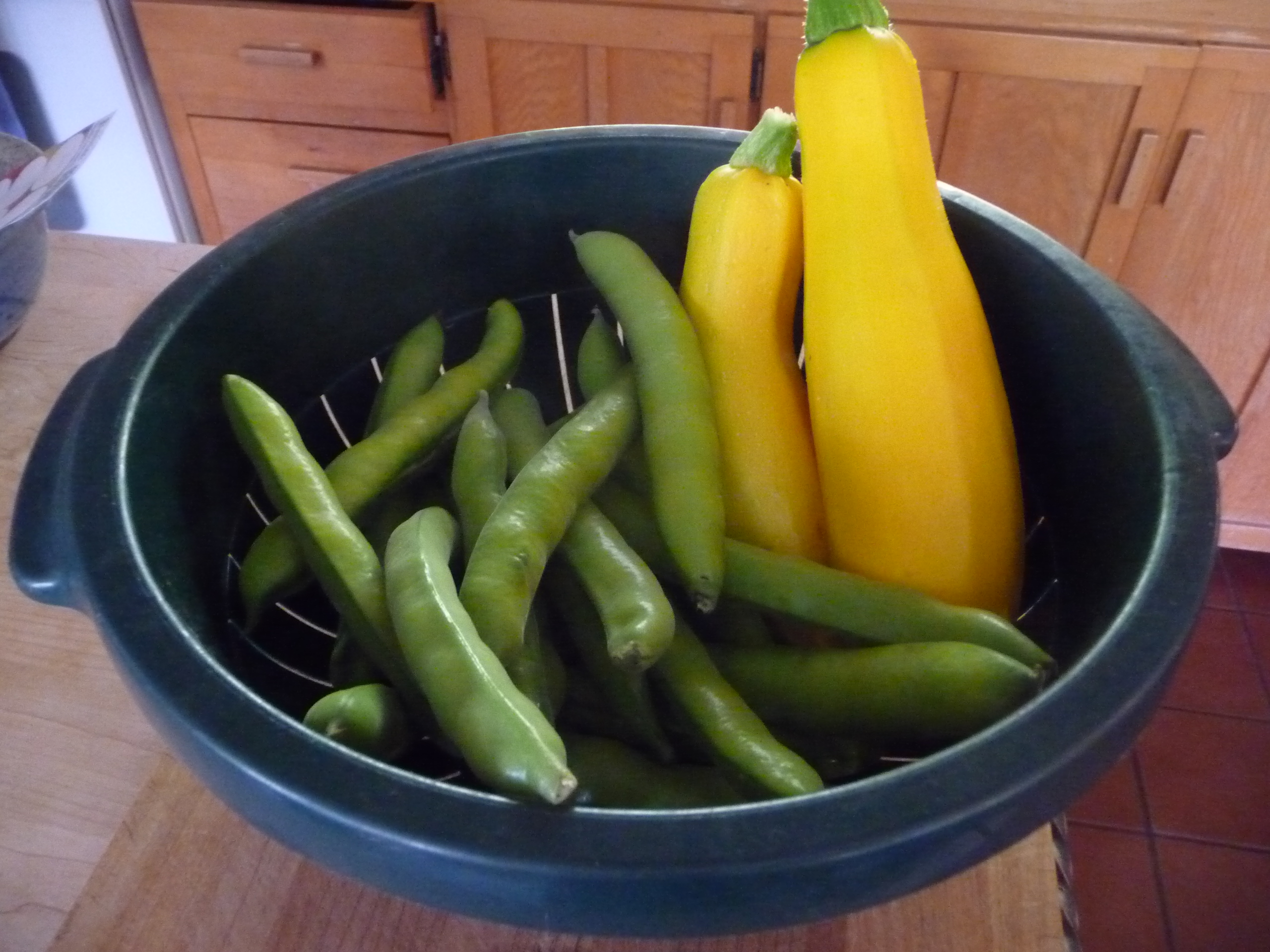 Overcast, cloudy, a good day to pick gooseberries (as John did), and then to sit in the cool kitchen to top and tail enough for jam, for a fool. (Every pun intended.) To pick broad beans and to sit (as I did) to shell them and inhale that earthy odour. Those, with a head of garlic and some kale, will be dinner tonight, with a small steak on the barbecue, and maybe even the first tomatoes, 3 Black Plums, that have ripened on the upper deck. These are the days. They go on for months, vegetables ripening, berries ready to pick, the failures forgotten as you reach into the bean plants to find yet another big pod filled with silken beans.