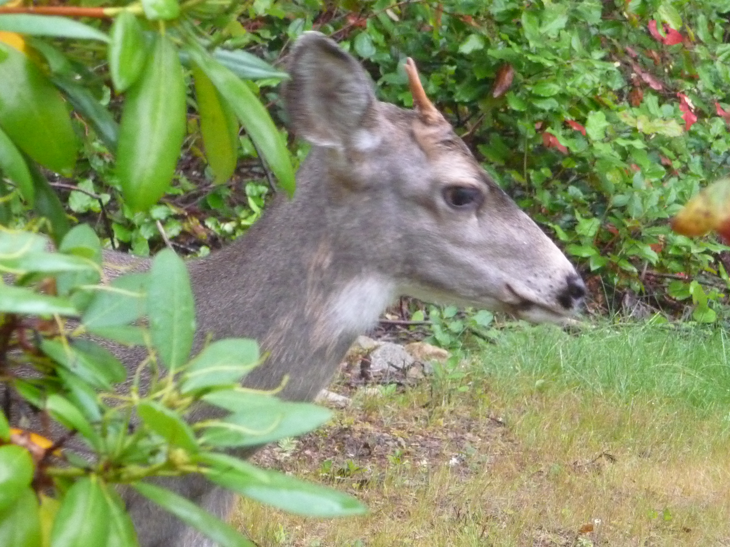 John called down, “There’s a deer right below my window,” and looking out, I saw her, arching her body to pee on the soft moss. I’m pretty sure it was last year’s doe, the one who came most mornings with her fawn,