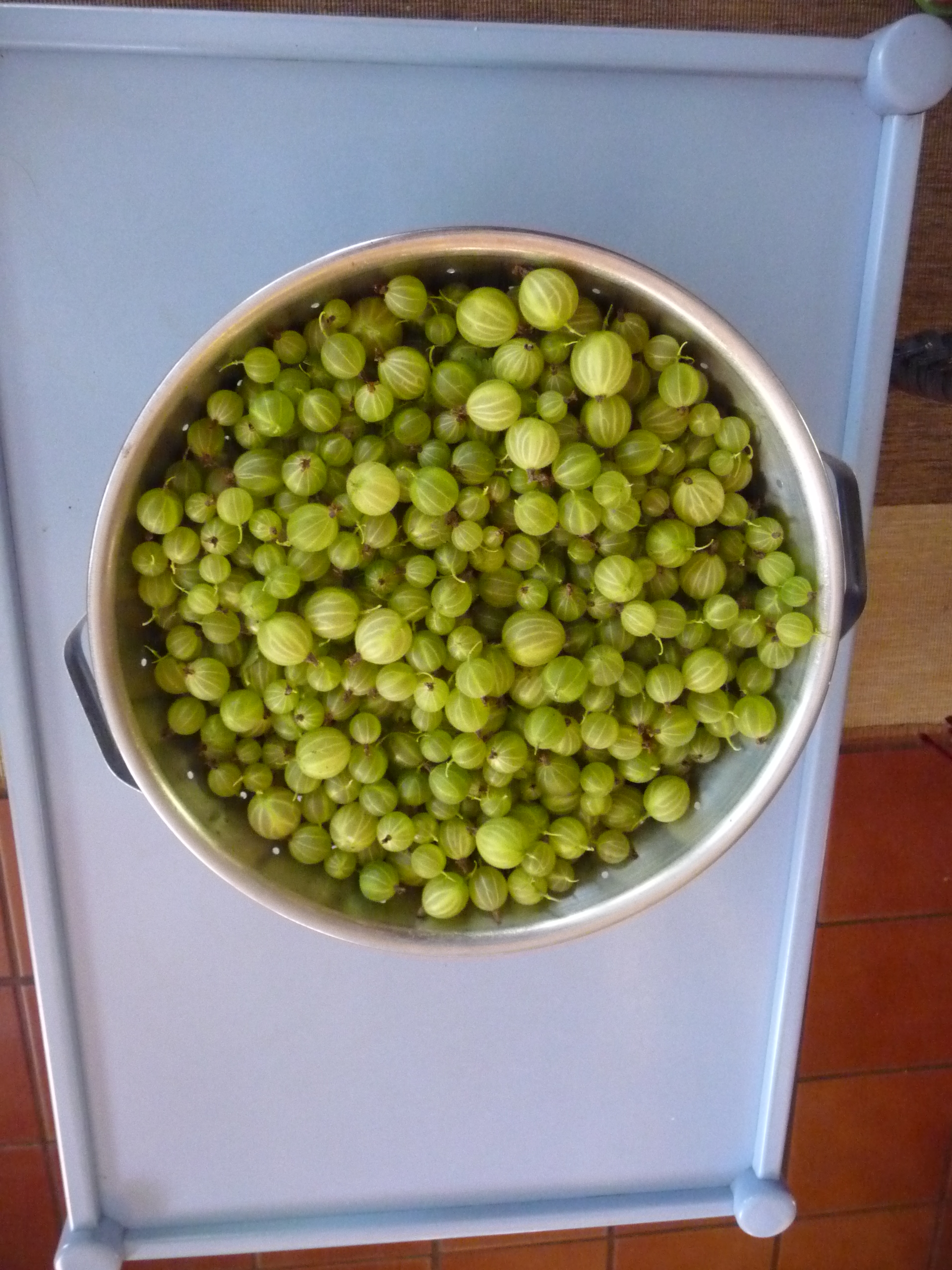 Overcast, cloudy, a good day to pick gooseberries (as John did), and then to sit in the cool kitchen to top and tail enough for jam, for a fool. (Every pun intended.) To pick broad beans and to sit (as I did) to shell them and inhale that earthy odour. Those, with a head of garlic and some kale, will be dinner tonight, with a small steak on the barbecue, and maybe even the first tomatoes, 3 Black Plums, that have ripened on the upper deck. These are the days. They go on for months, vegetables ripening, berries ready to pick, the failures forgotten as you reach into the bean plants to find yet another big pod filled with silken beans.