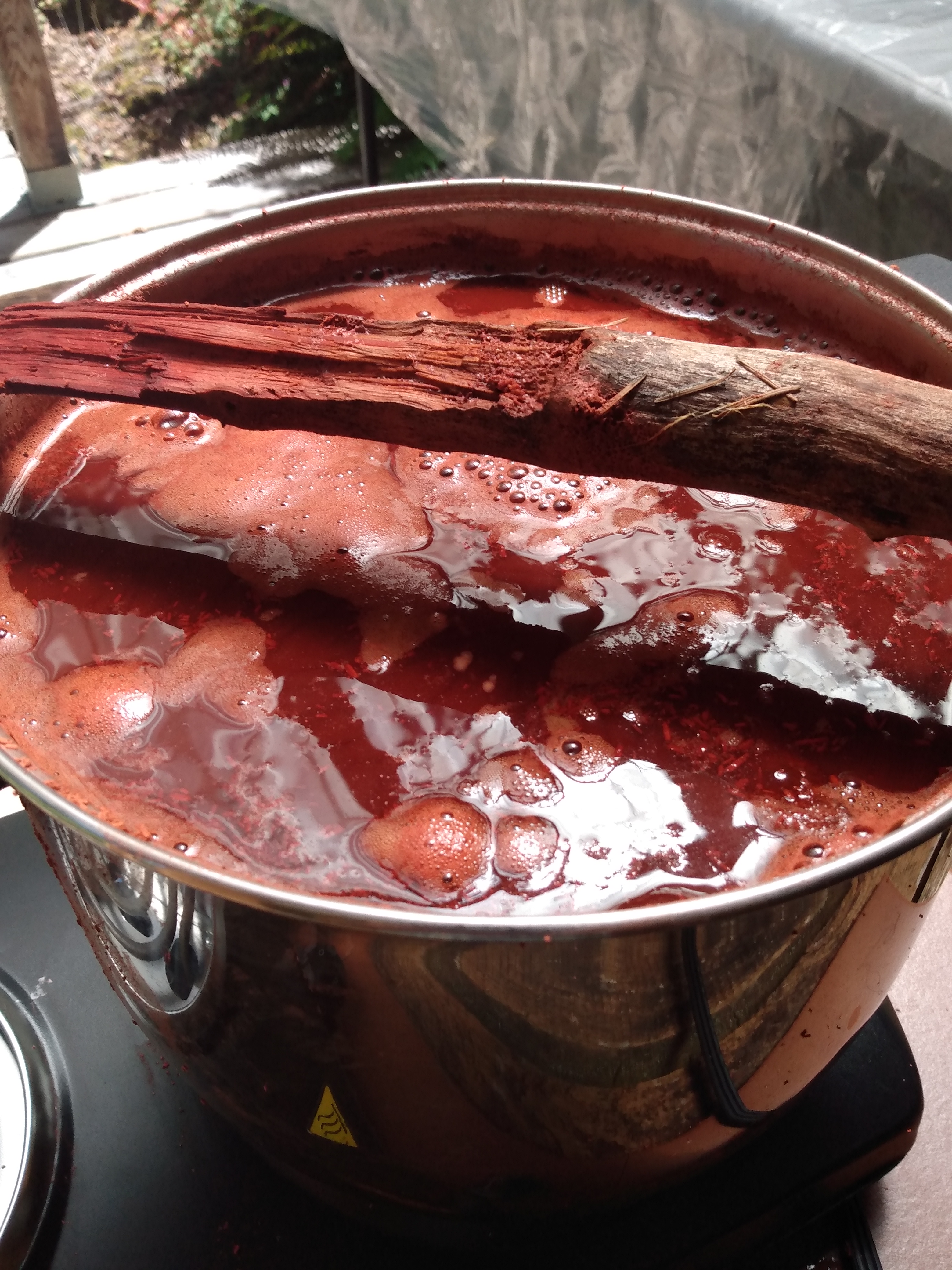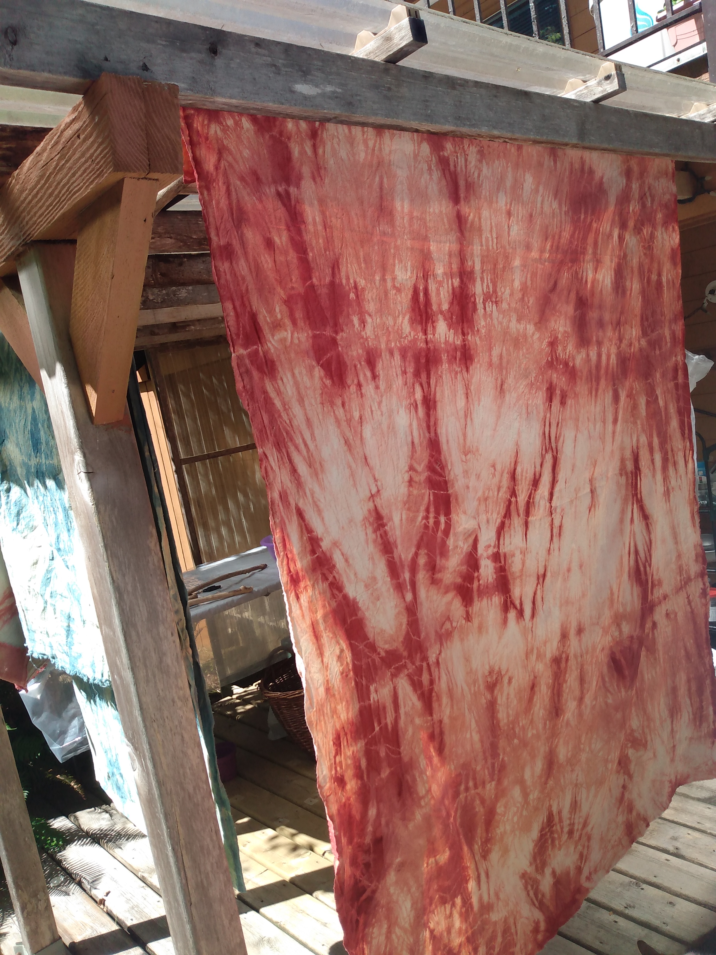 With the rose madder, it’s not quite the same. The fabric has to simmer in a mordant, then soak in a big pot of prepared dye on the little hotplate I have set up in my outdoor dye workshop.