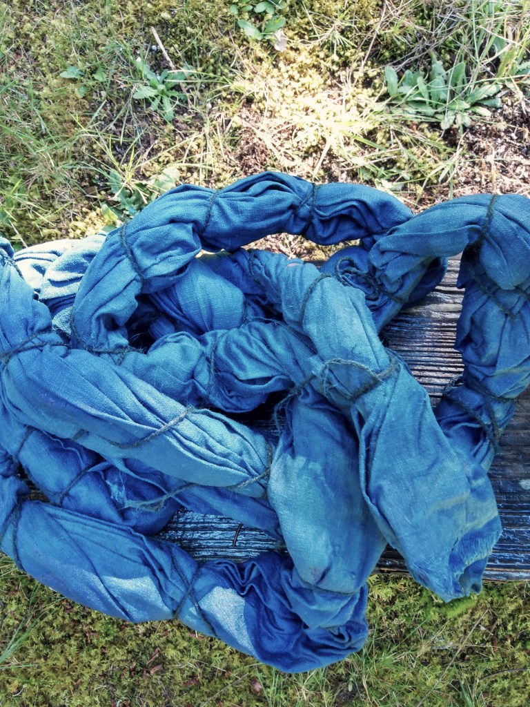 Behind the frame is another single-cloth quilt made of white linen dyed with indigo. The colour is quite different. The process is always interesting because I think I’m being honest when I say that I don’t really care about results; it’s what happens as I twist and tie scoured fabric, as I prepare the dye vat set up on a long cedar bench out by my vegetable garden, as I dip the lengths into the vat and then remove them to oxidize, watching the swampy colour turn the most beautiful blue.
