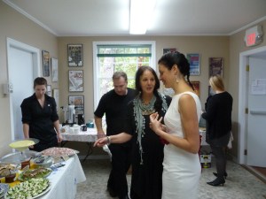 Some lovely surprises at the launch: Jeffrey Renn, our actor friend, who came in the door with a huge smile. And Kathy Munro and Bill Mann from Whitehorse! (They should get a prize for coming the longest distance…) I’d love to post some photographs but John’s are blurry. I think Mona will send some photos later — the cake in particular was spectacular! But luckily my young friend Isabelle drew my portrait while I was reading and so I can show you what an author looks like, dressed for the celebration of her novella. (Isabelle must have thought my reliable black dress was too dull so she gave me some colour.)
