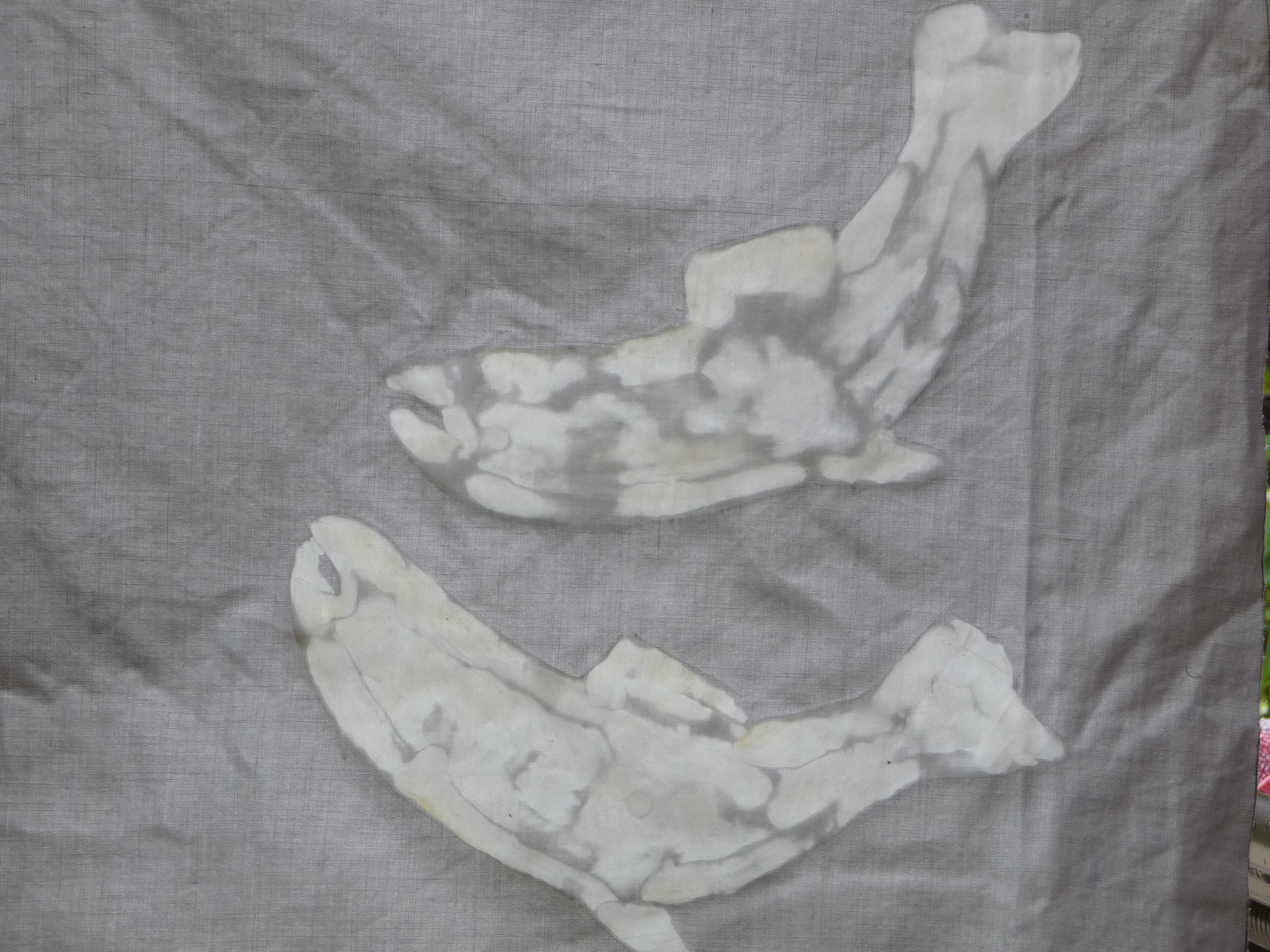 I love the blue — and that’s a good thing because my hands are stained for…well, the time being anyway. I did wear rubber gloves for the dye process but for the last part of the rinsing and squeezing out of the water, it was easier to use my bare hands. It didn’t take long for the squares to dry so I set up the ironing board on the deck by the front door (where the robin’s empty nest still waits among the roses) and gathered up as much paper — newsprint, without the print, the kind of paper books are often packed in; we save it all for High Ground Press shipping — as I could find and then began to iron the wax out of the cotton. I know that one can also boil or steam out the wax but I’m not entirely certain of how securely the dye is fixed so I thought it best to use the old iron my mother dropped on the basement floor and then passed along to me for batik projects — the steam function no longer works and the base is a bit wobbly but it heats! I’m not entirely satisfied with the finished squares because there’s a halo of wax which no amount of ironing will remove, even with absorbent paper towel. But then I remember that I do this because I can’t draw, I can’t paint, so the whole process has been really interesting and I can’t wait to piece together a quilt with these fish in their indigo water.