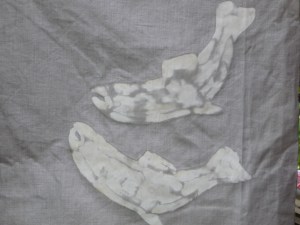 Then they got rinsed, and rinsed, and rinsed. I sat on the grass and removed the threads, hoping for lots of contrast: white wavy lines across the deep blue squares, the mostly white fish marbled with blue. And I have to say I was a little disappointed that the watery lines didn’t work as well as I’d hoped. I know why this is. My batik fish took up quite a lot of the surface space so I couldn’t pull the threads as tightly as I think they needed to be. But a project like this is so much about the process, the immersing of one’s self into the various steps required. So here are the squares drying on an old red sheet on the grass: