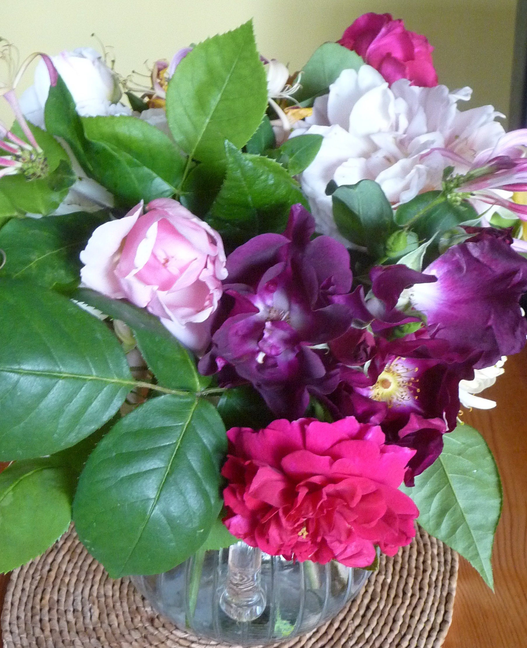 We’re preparing to leave tomorrow for a few nights with our grand-daughter in Edmonton. So that means a lot of watering today and the good graces of our neighbour Doreen who will come to water the tomato plants on Saturday. (They’re in big pots, about 20 of them, and they dry out quite quickly.) I had to stop at one point during the watering of the upper deck, though, because this corner (you can see my clumsy sign naming it Rose Corner) was so beautiful. A big swallowtail butterfly was pausing on the roses, a hummingbird was darting among them, and big bees were entering the throats of the nasturtiums and coming out with their pollen sacs laden. (Though when I came out with a camera, they’d disappeared…)