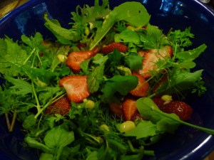 And the greens are easy to grow. Many self-seed. That miner’s lettuce is growing in a tub on a deck by my kitchen so I can snip leaves for small dishes and there are seedlings coming up in neighbouring pots too. I also planted a row of it so we can have larger amounts of it in salad. The arugula self-sows and that Diplotaxis is a short-lived perennial in my garden; I’ve planted more because I never know how many of last year’s plants will have survived the winter (and this winter was severe). Kale — well, it’s everywhere. I’d like to grow watercress but I don’t have a damp enough area. I do know several places to gather it though. And it’s another contender for the plant Rapunzel’s mother craved. Which makes me wonder why Rapunzel’s father didn’t have a small garden patch of his own?