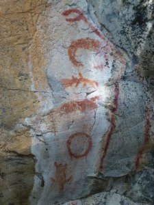 Pictographs can be found in all sorts of places in B.C. and had, still have, important commemorative and ceremonial functions. They are records, burial markers, boundary markers, and have significance beyond what we might to able to determine. This particular group of images — fish, crayfish, prawns — has always seemed to me to be an inventory, a list of marine life common to our area. It speaks to the notion that when the tide is out, the table is set. And how lively these animals still are, after perhaps a hundred and fifty years! The pigment is red ochre, bound with animal fat or fish eggs; it’s extremely durable.