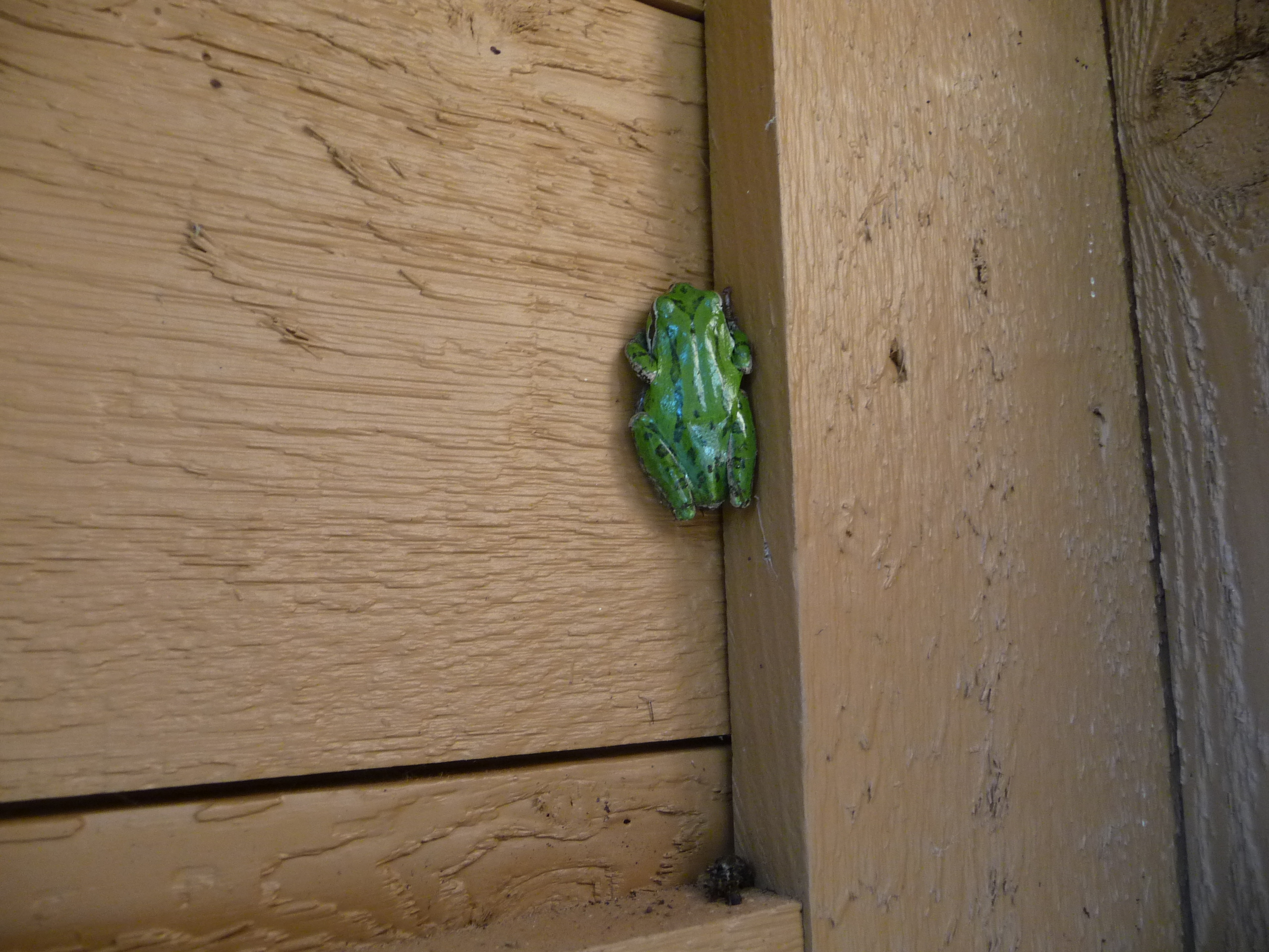 Three blue eggs, almost ready to hatch, from the robin nest above the beam carrying the wisteria across the patio to the porch. And, oh, where was the tree frog that usually greets me at the hot-tub in the morning, the one I’ve moved (for its own good, I tell it, knowing, even if it doesn’t, that chemicals aren’t good for creatures with such porous skins, skins needed for their respiratory processes) – moved to an old bathtub pond, moved to a trolley of verdant kitchen herbs, to a bowl of water growing scouring rush, to a collection of potted roses with damp soil. (“These weasels are quick, lithe, and unrelenting in their pursuit of anything they can overpower.”) A small green tree frog, poised on the edge of a hot-tub, its pale grey throat pulsing?