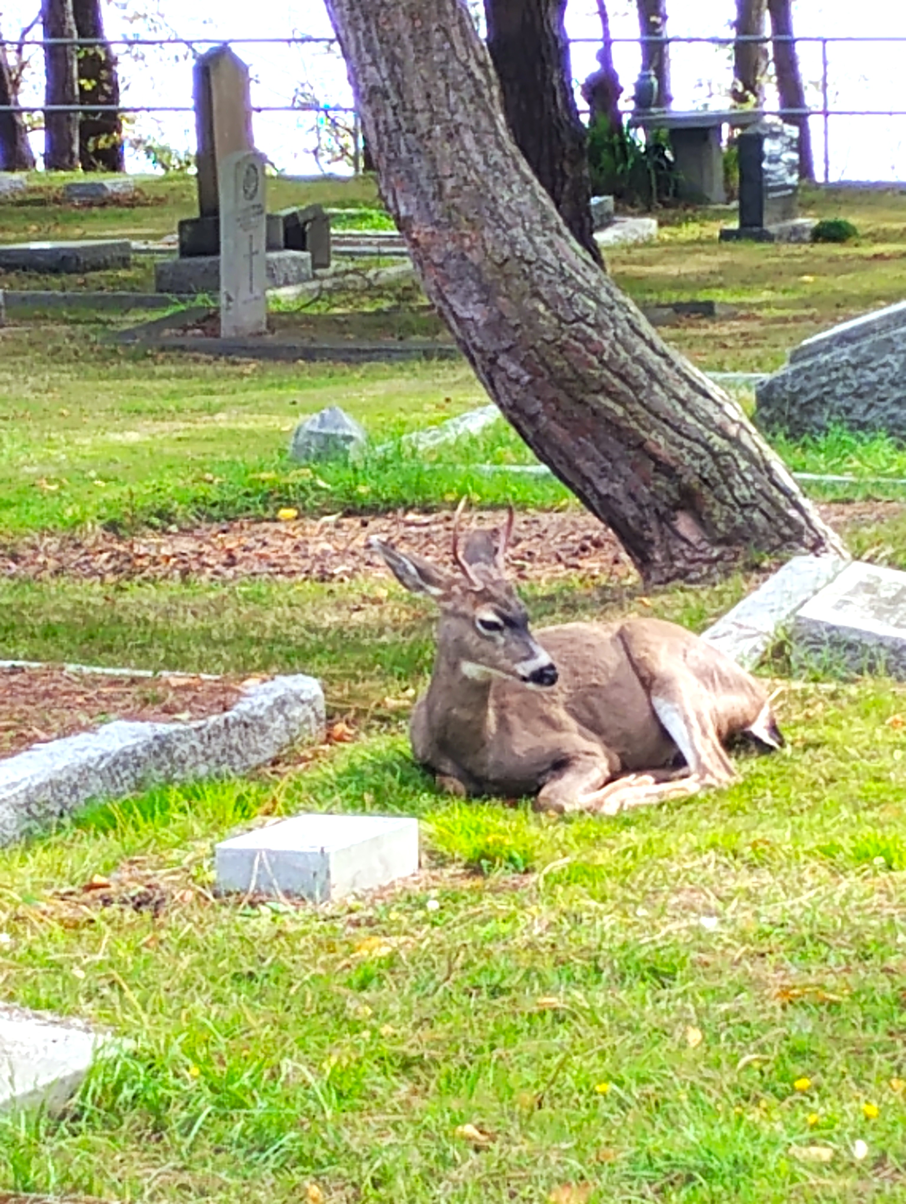 When I was a child living near the Ross Bay Cemetery in Victoria, I never saw deer lying on the graves. Never saw peacocks, or peahens, away from the lawns of Beacon Hill Park. Later, when my family lived at Royal Oak, we sometimes watched deer on the trail by our house, maybe heading for the apple orchards still productive in the area, the ones now turned into subdivisions. Never bears. Sometimes pheasants.