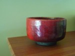 This red raku tea bowl was made by Wayne Ngan in the early 1970s. My then-sister-in-law Rosemary Kent (herself a potter) owned a small art gallery in Bastion Square in Victoria. They often had pieces made by Wayne. He’d come to Victoria from his home on Hornby Island with new pots. I fell in love with this one but couldn’t begin to afford it (I was a university student) and Rosemary surprised me with it at Christmas. The glaze is heart-stoppingly beautiful.